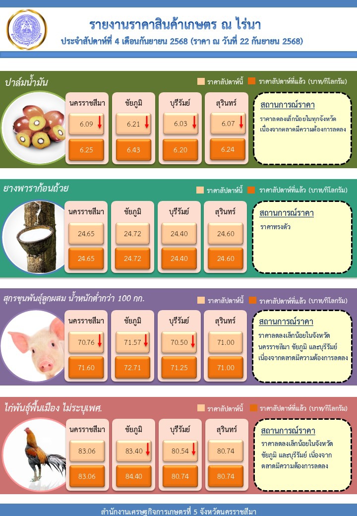รายงานราคาสินค้าเกษตร ณ ไร่นา ประจำสัปดาห์ที่ 4 เดือนกันยายน 2568 (ราคา ณ วันที่ 22 กันยายน 2568)