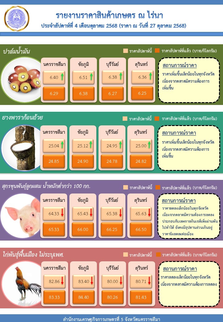 รายงานราคาสินค้าเกษตร ณ ไร่นา ประจำสัปดาห์ที่ 4 เดือนตุลาคม 2568 (ราคา ณ วันที่ 27 ตุลาคม 2568)