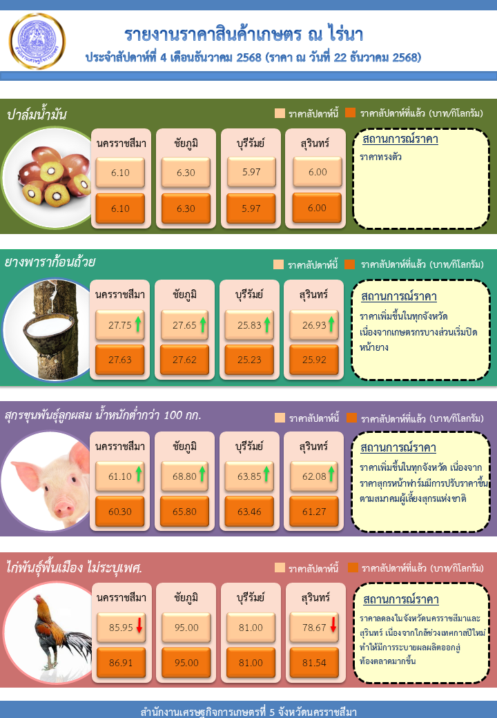 รายงานราคาสินค้าเกษตร ณ ไร่นา ประจำสัปดาห์ที่ 4 เดือนธันวาคม 2568 (ราคา ณ วันที่ 22 ธันวาคม 2568)