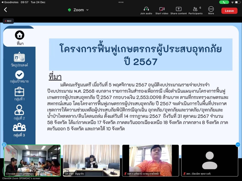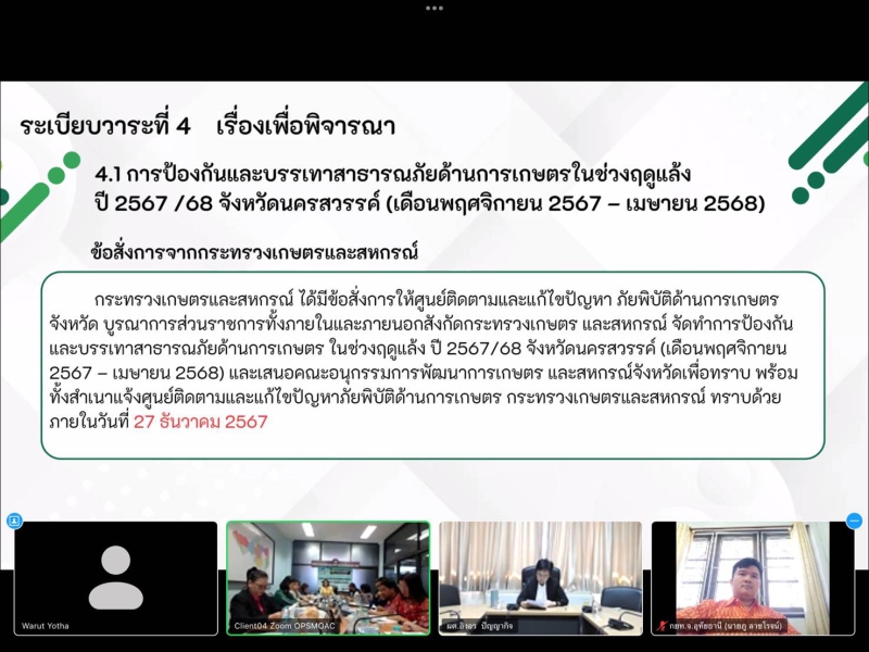วันที่ 24 ธันวาคม 2567 เวลา 9.30 น. ผู้ตรวจราชการกระทรวงเกษตรและสหกรณ์ (นางสาวอิงอร ปัญญากิจ) เป็นประธานการประชุมคณะกรรมการบริหารศูนย์ติดตามและแก้ไขปัญหาภัยพิบัติด้านการเกษตร จังหวัดนครสวรรค์ ครั้งที่ 2/2567 โดยมีหัวหน้าส่วนราชการในสังกัดกระทรวงเกษตรและสหกรณ์เข้าร่วมประชุม ผ่านระบบ Zoom Meeting ในที่ประชุมได้รับทราบ ดังนี้