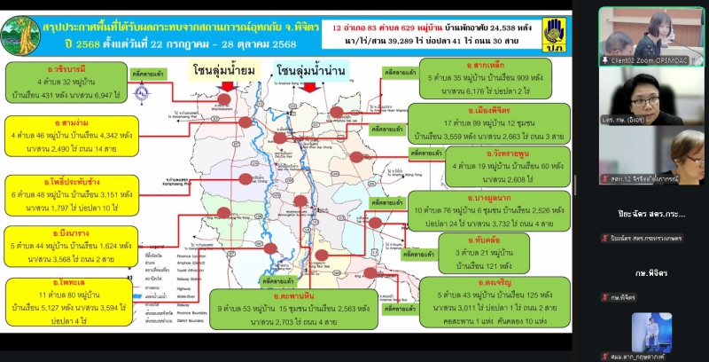 วันพฤหัสบดีที่ 30 ตุลาคม พ.ศ. 2568 เวลา 09.30 น. ณ ห้องประชุมสำนักตรวจราชการ (ห้อง 1406). และผ่านระบบประชุมทางไกลออนไลน์ นางสาวอิงอร ปัญญากิจ ผู้ตรวจราชการกระทรวงเกษตรและสหกรณ์ เป็นประธานการประชุมคณะกรรมการศูนย์ติดตามและแก้ไขปัญหาภัยพิบัติด้านการเกษตรจังหวัดพิจิตร ครั้งที่ 10/2568 พร้อมด้วยนางสาวอุไรรัตน์ คำชื่นวงศ์) เกษตรและสหกรณ์จังหวัดพิจิตร ในฐานะฝ่ายเลขานุการการประชุมฯ คณะกรรมการศูนย์ติดตามและแก้ไขปัญหาภัยพิบัติด้านการเกษตรฯ และเจ้าหน้าที่ที่เกี่ยวข้อง เข้าร่วมประชุมคณะกรรมการศูนย์ติดตามและแก้ไขปัญหาภัยพิบัติด้านการเกษตรจังหวัดพิจิตร ฯ ที่ประชุมรับรองรายงานการประชุม ครั้งที่ 9/2568 และรับทราบรายงานสถานการณ์ทั่วไปในพื้นที่จังหวัดพิจิตร และการแจ้งเตือนภัย สถานการณ์ในพื้นที่จังหวัด สถานการณ์นำ และแผนการบริหารจัดการน้ำ สถานการณ์การผลิตด้านการเกษตร (ด้านพืช,ประมง,ปศุสัตว์) และการเฝ้าระวังโรคระบาดในช่วงฤดูฝน ข้อมูลเตือนภัยการเกษตร ประกาศเขตพื้นที่ประสบสาธารณภัย และเขตการให้ความช่วยเหลือผู้ประสบภัยพิบัติกรณีฉุกเฉิน อุทกภัย และพื้นที่การเกษตรที่เสียหายจากสถานการณ์อุทกภัย ปี 2568 (ด้านพืช,ประมง,ปศุสัตว์)