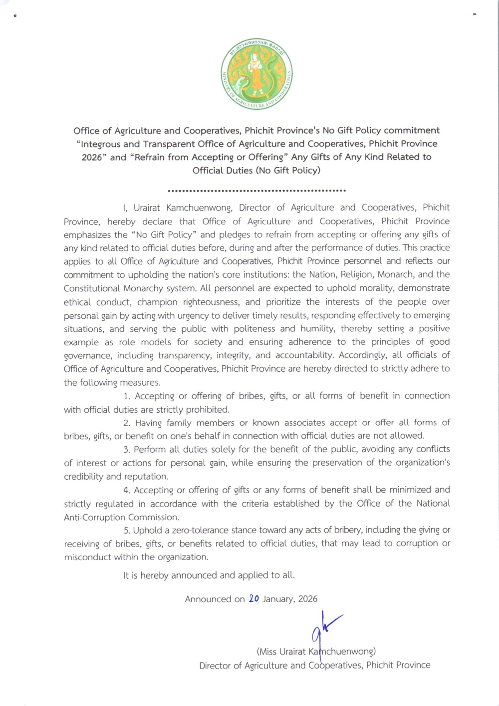 ประกาศเจตนารมณ์ เรื่อง "สุจริต โปร่งใส สำนักงานเกษตรและสหกรณ์จังหวัดพิจิตรใสสะอาด 2569" และ "งดรับ งดให้" ของขวัญ ของกำนัลทุกชนิดจากการปฏิบัติหน้าที่ (No Gift Policy)