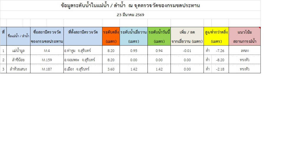 สถานการณ์น้ำจังหวัดสุรินทร์ ประจำวันที่ 23 มีนาคม 2569