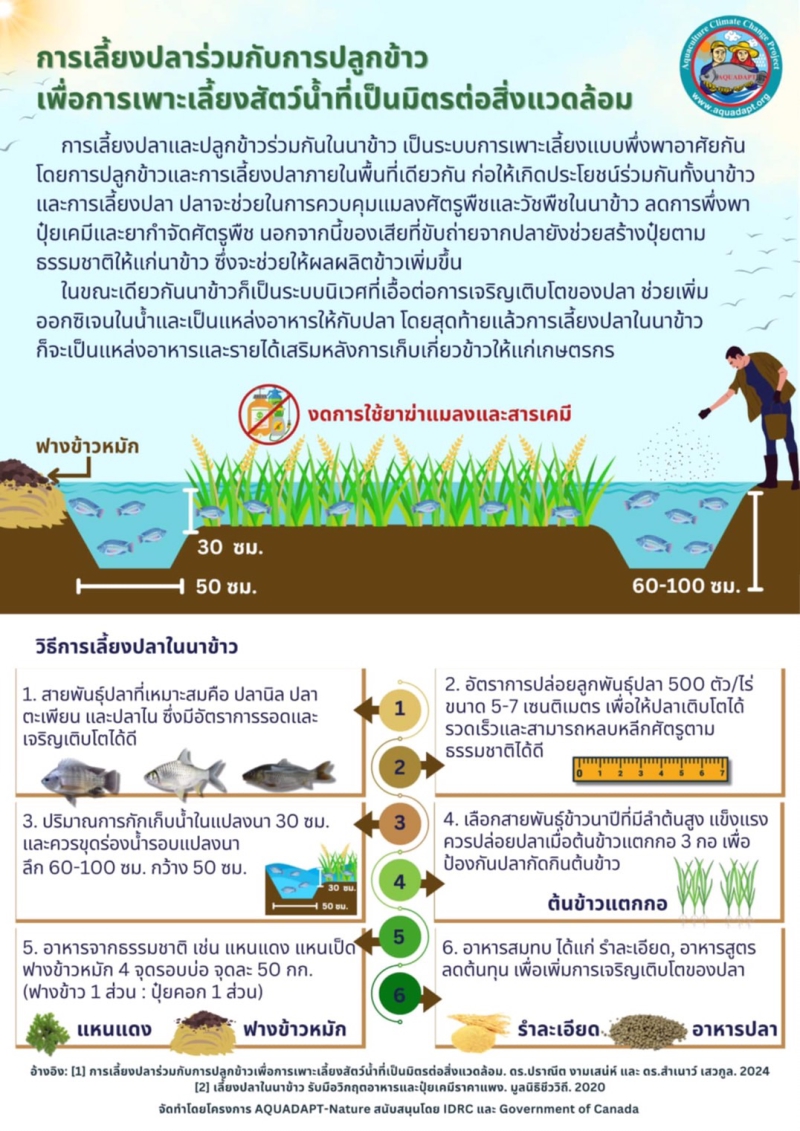 ปลาที่นิยมเลี้ยงในนาข้าว ปลาตะเพียนขาว – โตเร็ว อึด ทน น้ำตื้น ปลานิล – เจริญเติบโตดีในนาข้าวที่มีน้ำขังนาน ปลาดุก – ทนทาน เหมาะกับนาน้ำลึกปานกลาง ปลาหมอไทย – เลี้ยงง่าย ขายดีในชุมชน