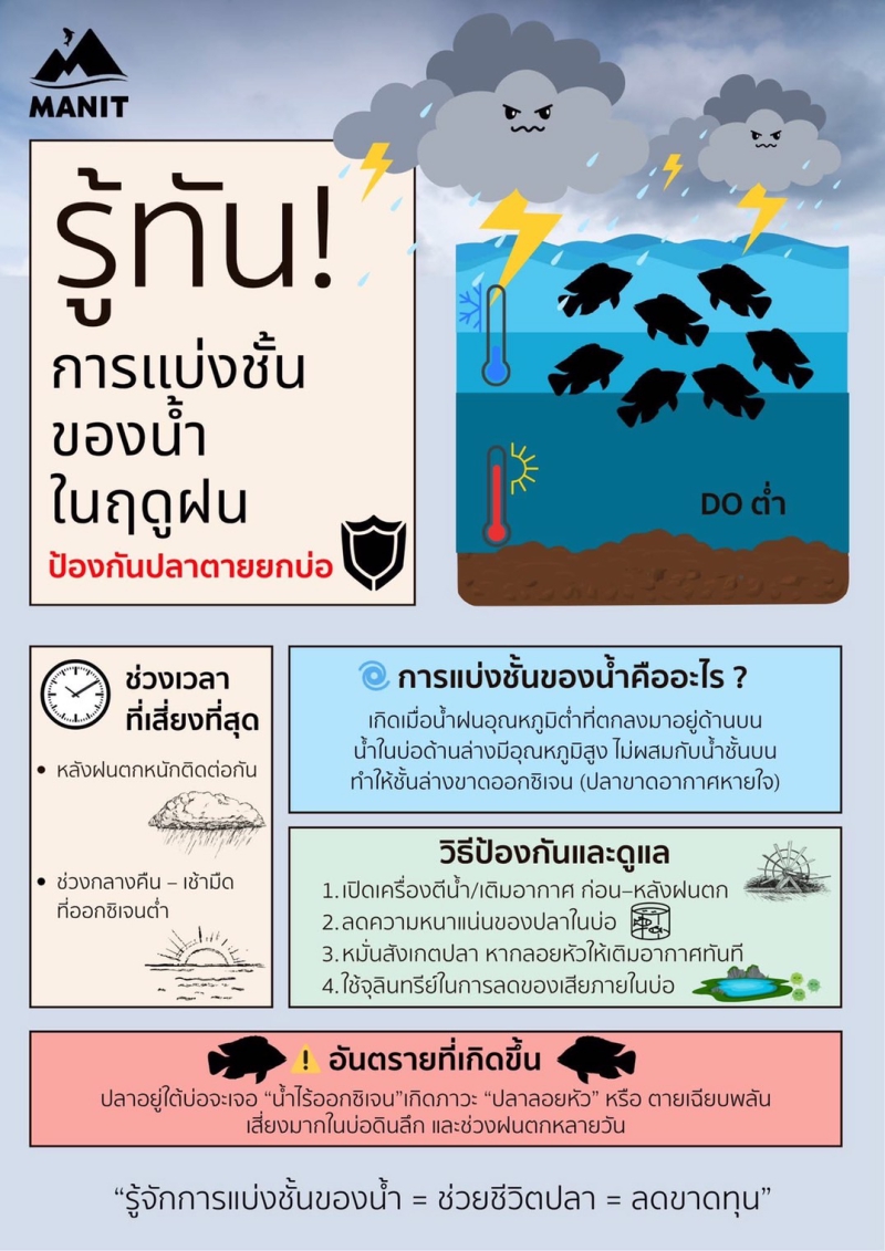 3. แนะวิธี ดูแลสัตว์น้ำในช่วงฤดูฝน "รู้ทัน! การแบ่งชั้นของน้ำในฤดูฝน พร้อมป้องกันปลาตายทั้งบ่อ" ช่วยชีวิตปลา = ลดขาดทุน