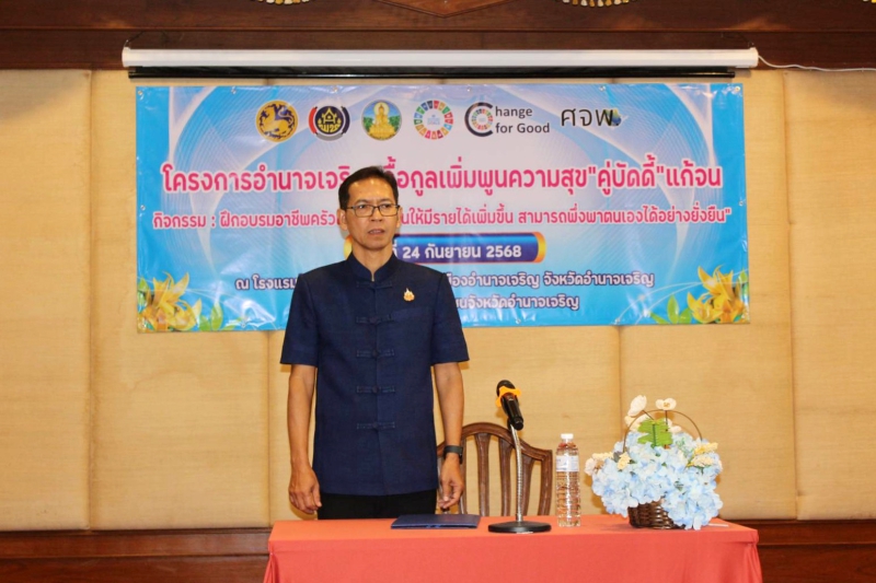 วันพุธที่ 24 กันยายน 2568 นางปารีณา สอนอาจ เกษตรและสหกรณ์จังหวัดอำนาจเจริญ มอบหมายให้นางสาวปิยะพร สุริโยตระกูล นักวิเคราะห์นโยบายและแผนชำนาญการ เข้าร่วมพิธีเปิดโครงการอำนาจเจริญเกื้อกูลเพิ่มพูนความสุข คู่บัดดี้ แก้จน ณ โรงแรมฝ้ายขิด ตำบลบุ่ง อำเภอเมืองอำนาเจริญ จังหวัดอำนาจเจริญ โดยมีนายเสนีย์ ส้มเขียวหวาน รองผู้ว่าราชการจังหวัดอำนาจเจริญ เป็นประธานในพิธีเปิด