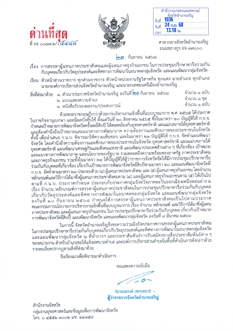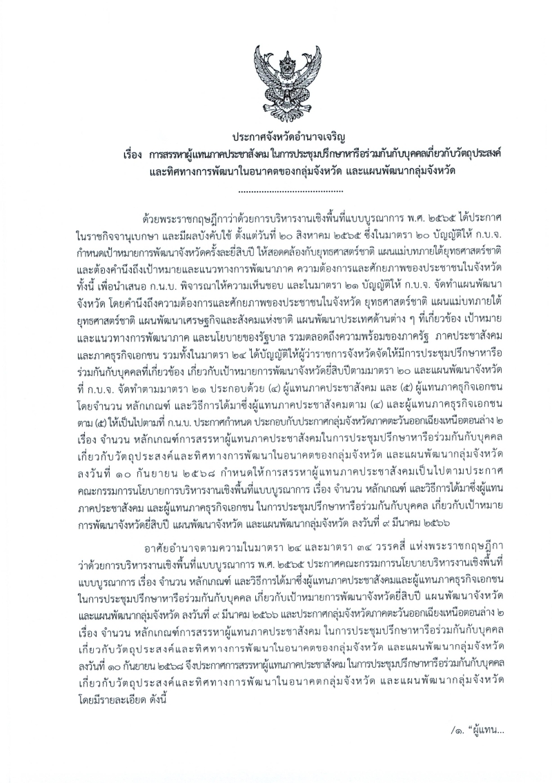 จังหวัดอำนาจเจริญ ประชาสัมพันธ์การสรรหาผู้แทนภาคประชาสังคมและผู้แทนภาคธุรกิจเอกชน ในการประชุมปรึกษาหารือร่วมกันกับบุคคลเกี่ยวกับวัตถุประสงค์และทิศทางการพัฒนาในอนาคตกลุ่มจังหวัด และแผนพัฒนากลุ่มจังหวัด