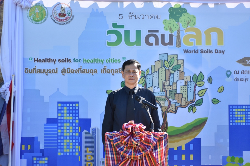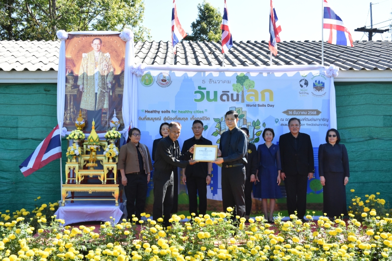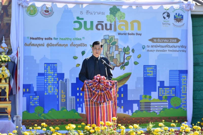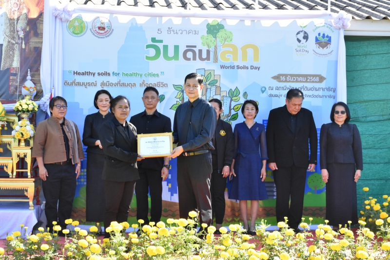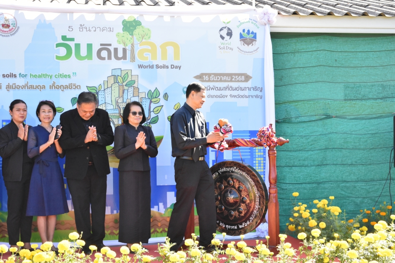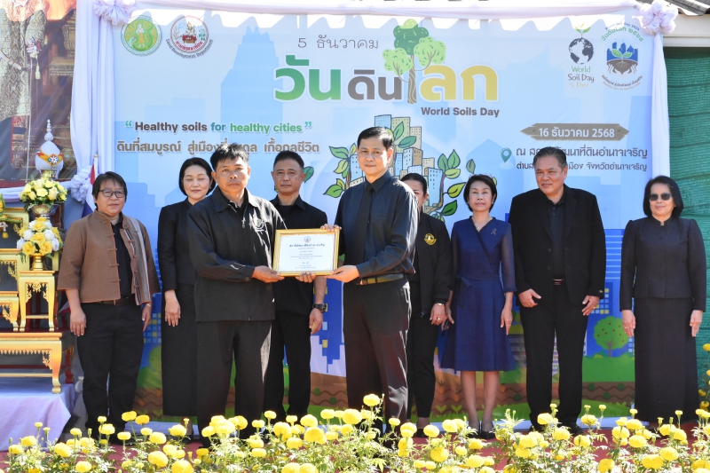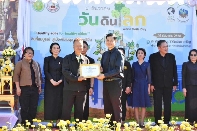 วันอังคารที่ 16 ธันวาคม 2568 เวลา 09.00 น. นางปารีณา สอนอาจ เกษตรและสหกรณ์จังหวัดอำนาจเจริญ พร้อมด้วยข้าราชการและเจ้าหน้าที่สำนักงานฯ เข้างานวันดินโลก ประจำปี พ.ศ. 2568 Word Soil Day “ดินที่สมบูรณ์ สู่เมืองที่สมดุล เกื้อกูลชีวิต” น้อมรำลึกพระมหากรุณาธิคุณ องค์นักวิทยาศาสตร์ดินเพื่อมนุษธรรม พระบาทสมเด็จพระบรมชนกาธิเบศร มหาภูมิพลอดุลยเดชมหาราช บรมนาถบพิตร ณ สถานีพัฒนาที่ดินอำนาจเจริญ ตำบลบุ่ง อำเภอเมืองอำนาจเจริญ จังหวัดอำนาจเจริญ โดยมีนายเทพรัตน์ ตันตยานนท์ รองผู้ว่าราชการจังหวัดอำนาจเจริญ เป็นประธาน นางสาวนตนภา คูณพัน ผู้อำนวยการสถานีพัฒนาที่ดินอำนาจเจริญ เป็นผู้กล่าวรายงาน และมีหัวหน้าส่วนราชการ ข้าราชการ เจ้าหน้าที่ คณะครู นักเรียน และหมอดินอาสา เข้าร่วมงานเป็นจำนวนมาก