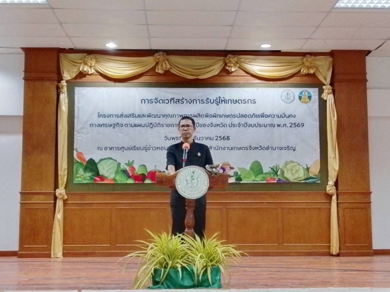 วันพุธที่ 24 ธันวาคม 2568 เวลา 08.30 น. นางปารีณา สอนอาจ เกษตรและสหกรณ์จังหวัดอำนาจเจริญ มอบหมายนางสาวปิยะพร สุริโยตระกูล หัวหน้ากลุ่มสารสนเทศการเกษตร สำนักงานฯ เข้าร่วมพิธีเปิดการจัดเวทีสร้างการรับรู้ให้เกษตรกรโครงการส่งเสริมและพัฒนาคุณภาพการผลิตพืชผักเกษตรปลอดภัยเพื่อความมั่นคงทางเศรษฐกิจ ตามแผนปฏิบัติราชการประจำปีของจังหวัด ประจำปีงบประมาณ พ.ศ. 2569 โดยมีนายเสนีย์ ส้มเขียวหวาน ผู้ว่าราชการจังหวัดอำนาจเจริญ เป็นประธานในพิธีฯ มีนายไพศาล แก้วบุตรดี เกษตรจังหวัดอำนาจเจริญ กล่าวรายงาน การจัดเวทีสร้างการรับรู้ ให้เกษตรกร โครงการฯ ในพื้นที่ 7 อำเภอของจังหวัดอำนาจเจริญ รวมทั้งสิ้น 140 ราย ณ อาคารศูนย์เรียนรู้ข้าวหอมมะลิอำนาจเจริญ สำนักงานเกษตรจังหวัดอำนาจเจริญ มีวัตถุประสงค์เพื่อพัฒนาจังหวัดอำนาจเจริญ ให้เป็นแหล่งผลิตพืชผักปลอดภัยให้มีคุณภาพ มาตรฐาน สร้างรายได้ไห้แก่เกษตรกร สร้างมูลค่าสินค้าทางการเกษตรแก่จังหวัดให้มีผลิตผลสูงขึ้น สามารถแข่งขันได้ ตลอดจนพัฒนาให้เกษตรกรมีความเข้มแข็ง สามารถพึ่งตนเองได้ เกิดการรับรู้ในกระบวนการผลิตพืชผัก เกษตรปลอดภัย สามารถพัฒนาคุณภาพผลผลิตให้มีคุณภาพมาตรฐาน สร้างรายได้ให้แก่ตนเอง