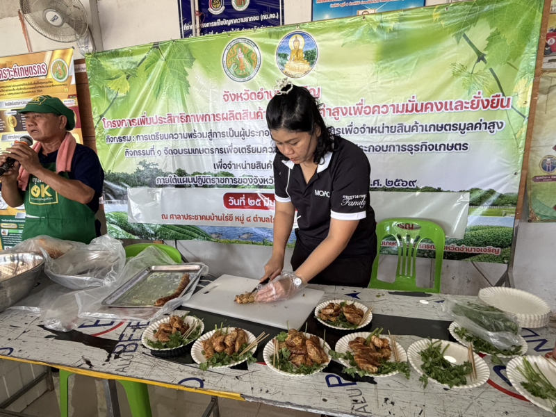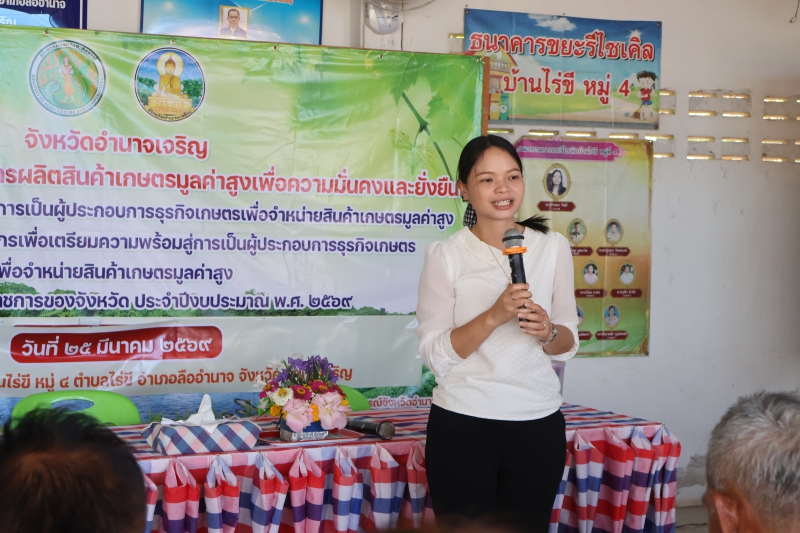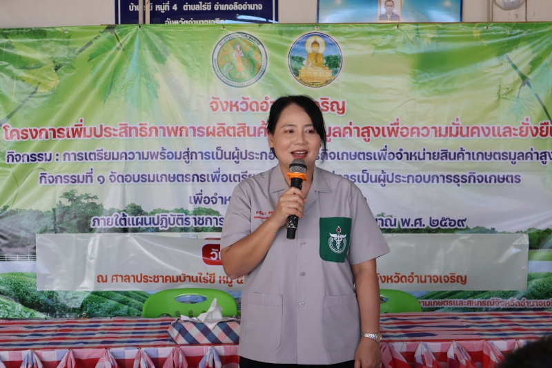 เกษตรและสหกรณ์จังหวัดอำนาจเจริญ กล่าวว่า โครงการเพิ่มประสิทธิภาพการผลิตสินค้าเกษตรมูลค่าสูง เพื่อความมั่นคงและยั่งยืน ภายใต้แผนปฏิบัติราชการของจังหวัด ประจำปีงบประมาณ พ.ศ. 2569 โดยสำนักงานประมงจังหวัดอำนาจเจริญ ร่วมกับสำนักงานปศุสัตว์จังหวัดอำนาจเจริญ และสำนักงานเกษตรและสหกรณ์จังหวัดอำนาจเจริญ ทางด้านสำนักงานเกษตรและสหกรณ์จังหวัดอำนาจเจริญ รับผิดชอบ กิจกรรมหลักที่ 3 การเตรียมความพร้อมสู่การเป็นผู้ประกอบการธุรกิจเกษตรเพื่อจำหน่ายสินค้าเกษตรมูลค่าสูง กำหนดจัดอบรม จำนวน 7 รุ่น เกษตรกร จำนวน 350 ราย มีหลักสูตรอบรมให้ความรู้ในเรื่อง การเตรียมความพร้อมสู่การเป็นผู้ประกอบการธุรกิจเกษตร เพื่อจำหน่ายสินค้าเกษตรมูลค่าสูง การพัฒนาสินค้าเกษตรมูลค่าสูงให้เป็นมิตรต่อสิ่งแวดล้อม ตามแนวทาง BCG Model เพื่อยกระดับสินค้าเกษตรมูลค่าสูง การพัฒนาความรู้การทำแผนธุรกิจ (Business Model) การวางแผนการเงิน การประเมินความเสี่ยง การบริหารจัดการความเสี่ยง และการเข้าถึงแหล่งเงินทุน ยกระดับมาตรฐานผลิตภัณฑ์ชุมชน (มผช.) และการพัฒนาผลิตภัณฑ์เพื่อเข้าสู่ระบบรับรองมาตรฐานสินค้าเกษตร การแปรรูปสินค้าเกษตรเพื่อสร้างมูลค่า - กิจกรรมสาธิต การแปรรูปปลาดุก และการแปรรูปไก่พื้นเมือง (วิทยากรภาคเอกชน : แปลงใหญ่โคเนื้อกลุ่มอนุรักษ์และพัฒนาการเลี้ยงสัตว์บ้านหวาย ตำบลบุ่ง อำเภอเมือง จังหวัดอำนาจเจริญ) และการแลกเปลี่ยนข้อคิดเห็น ถาม - ตอบ โดย เจ้าหน้าที่สำนักงานเกษตรและสหกรณ์จังหวัดอำนาจเจริญ
