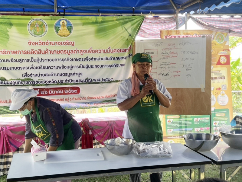 โครงการเพิ่มประสิทธิภาพการผลิตสินค้าเกษตรมูลค่าสูง เพื่อความมั่นคงและยั่งยืน ภายใต้แผนปฏิบัติราชการของจังหวัด ประจำปีงบประมาณ พ.ศ. 2569 โดยสำนักงานประมงจังหวัดอำนาจเจริญ ร่วมกับสำนักงานปศุสัตว์จังหวัดอำนาจเจริญ และสำนักงานเกษตรและสหกรณ์จังหวัดอำนาจเจริญ ทางด้านสำนักงานเกษตรและสหกรณ์จังหวัดอำนาจเจริญ รับผิดชอบ กิจกรรมหลักที่ 3 การเตรียมความพร้อมสู่การเป็นผู้ประกอบการธุรกิจเกษตรเพื่อจำหน่ายสินค้าเกษตรมูลค่าสูง กำหนดจัดอบรม จำนวน 7 รุ่น เกษตรกร จำนวน 350 ราย มีหลักสูตรอบรมให้ความรู้ในเรื่อง การเตรียมความพร้อมสู่การเป็นผู้ประกอบการธุรกิจเกษตร เพื่อจำหน่ายสินค้าเกษตรมูลค่าสูง การพัฒนาสินค้าเกษตรมูลค่าสูงให้เป็นมิตรต่อสิ่งแวดล้อม ตามแนวทาง BCG Model เพื่อยกระดับสินค้าเกษตรมูลค่าสูง การพัฒนาความรู้การทำแผนธุรกิจ (Business Model) การวางแผนการเงิน การประเมินความเสี่ยง การบริหารจัดการความเสี่ยง และการเข้าถึงแหล่งเงินทุน ยกระดับมาตรฐานผลิตภัณฑ์ชุมชน (มผช.) และการพัฒนาผลิตภัณฑ์เพื่อเข้าสู่ระบบรับรองมาตรฐานสินค้าเกษตร การแปรรูปสินค้าเกษตรเพื่อสร้างมูลค่า - กิจกรรมสาธิต การแปรรูปปลาดุก และการแปรรูปไก่พื้นเมือง (วิทยากรภาคเอกชน : แปลงใหญ่โคเนื้อกลุ่มอนุรักษ์และพัฒนาการเลี้ยงสัตว์บ้านหวาย ตำบลบุ่ง อำเภอเมือง จังหวัดอำนาจเจริญ) และการแลกเปลี่ยนข้อคิดเห็น ถาม - ตอบ โดย เจ้าหน้าที่สำนักงานเกษตรและสหกรณ์จังหวัดอำนาจเจริญ