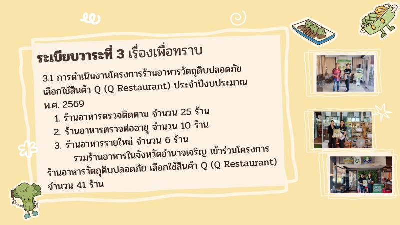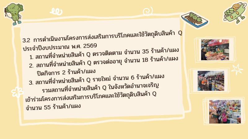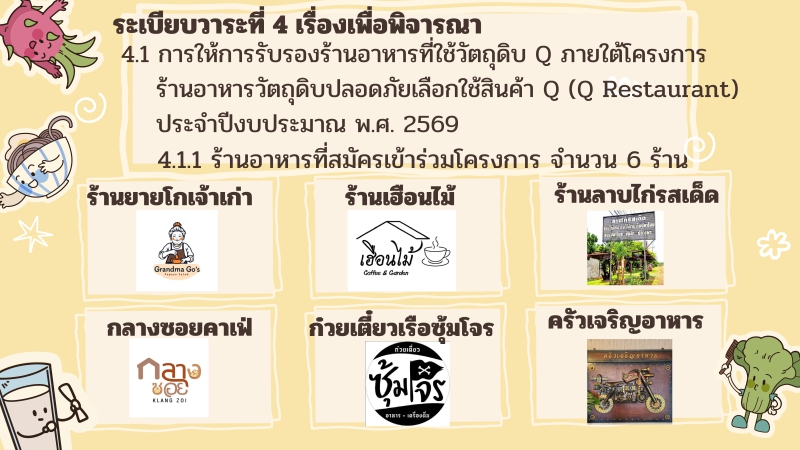 ซึ่งการประชุมในครั้งนี้ ประธานได้แจ้งให้ที่ประชุมทราบในเรื่องรับรองรายงานการประชุม จากนั้นเป็นเรื่องเพื่อทราบ ซึ่งที่ประชุมได้ติดตามการดำเนินงานโครงการร้านอาหารวัตถุดิบปลอดภัย เลือกใช้สินค้า Q (Q Restaurant) ปีงบประมาณ พ.ศ. 2569 การดำเนินงานโครงการส่งเสริมการบริโภคและใช้วัตถุดิบสินค้า Q ปีงบประมาณ พ.ศ. 2569 และที่ประชุมได้ร่วมกันพิจารณารับรองร้านอาหารวัตถุดิบปลอดภัยเลือกใช้สินค้า Q ภายใต้ โครงการร้านอาหารวัตถุดิบปลอดภัยเลือกใช้สินค้า Q (Q Restaurant) ปีงบประมาณ พ.ศ. 2569 และการรับรองสถานที่จำหน่ายสินค้า Q ภายใต้โครงการส่งเสริมการบริโภคและใช้วัตถุดิบสินค้า Q ปีงบประมาณ พ.ศ. 2569