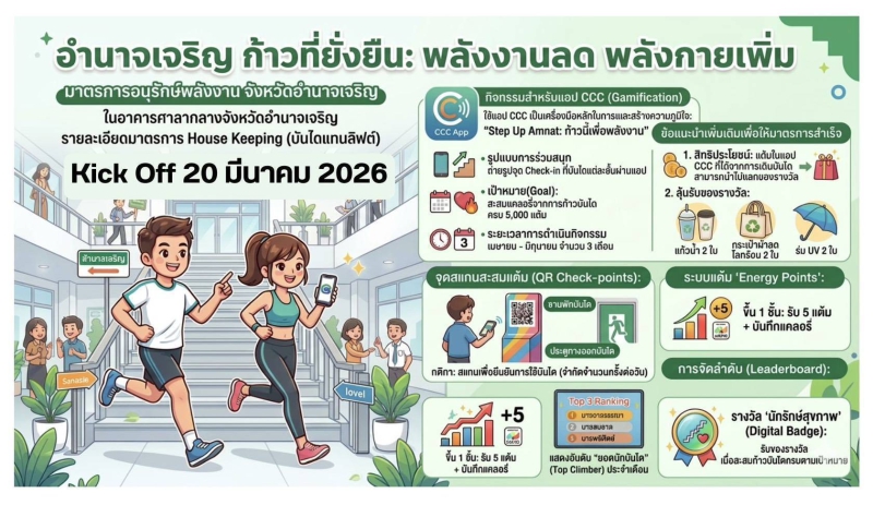วันอังคารที่ 7 เมษายน 2569 เวลา 15.30 น. นางปารีณา สอนอาจ เกษตรและสหกรณ์จังหวัดอำนาจเจริญ พร้อมด้วยข้าราชการและเจ้าหน้าที่ ร่วมสมัคร Application CCC: Calories Credit Challenge กิจกรรม "อำนาจเจริญ ก้าวที่ยั่งยืน : พลังงานลด พลังกายเพิ่ม ภายโต้มาตรการประหยัดพลังงานอาคารศาลากลางจังหวัดอำนาจเจริญ ตามนโยบายของนายเสนีย์ ส้มเขียวหวาน ผู้ว่าราชการจังหวัดอำนาจเจริญ เรื่องมาตรการประหยัดพลังงานอาคารศาลากลางจังหวัดอำนาจเจริญ โดยขอให้หน่วยงานที่มีสำนักงานตั้งอยู่ภายในอาคารศาลากลางจังหวัดอำนาจเจริญ ทุกหน่วยงาน ปฏิบัติตามมาตรการประหยัดพลังงานในอาคารศาลากลางจังหวัดอำนาจเจริญอย่างเคร่งครัด รวมไปถึงบริหารจัดการและลดการใช้พลังงานให้ได้มากที่สุด ซึ่งจะช่วยลดค่าใช้จ่ายด้านพลังงานและเป็นต้นแบบแก่ภาคเอกชนและประชาชน เพื่อปลูกจิตสำนึกและส่งเสริมการมีส่วนร่วมในการประหยัดพลังงาน