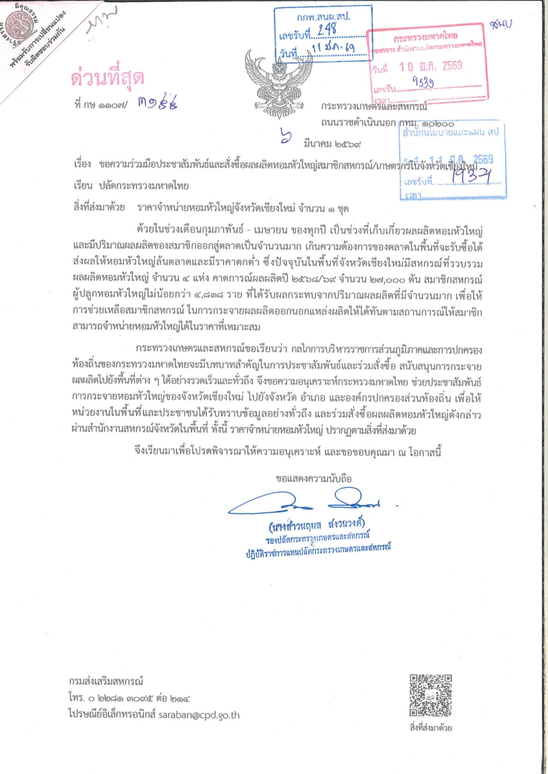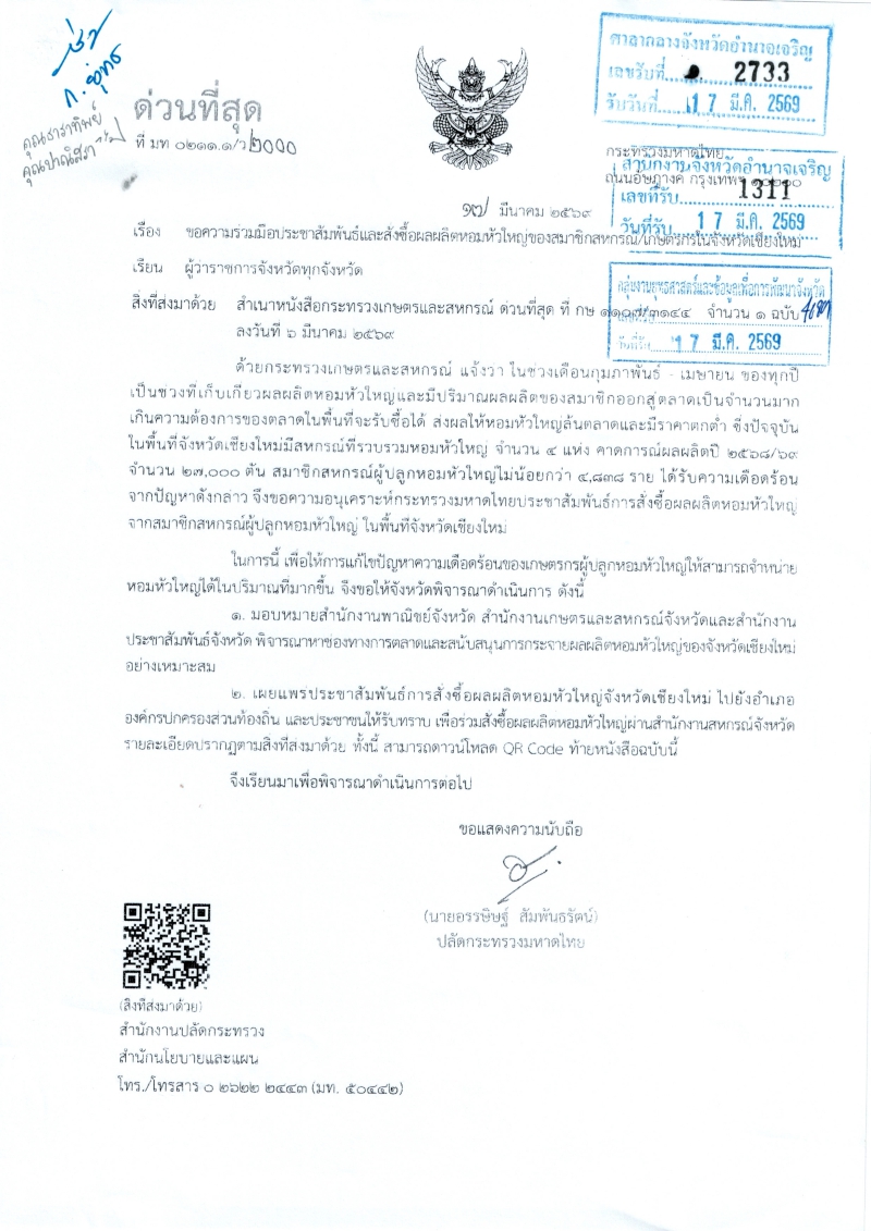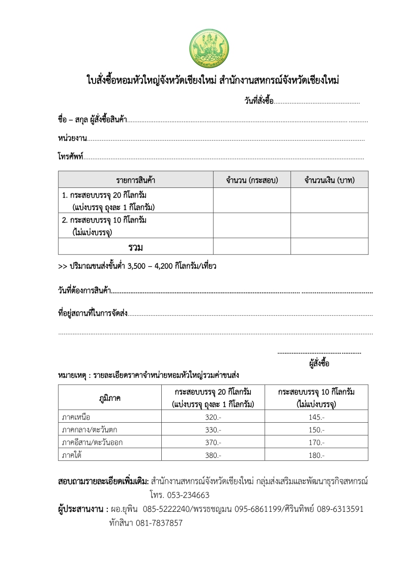 สนง.กษ.อำนาจเจริญ ประชาสัมพันธ์ ขอความร่วมมือประชาสัมพันธ์และสั่งซื้อผลผลิตหอมหัวใหญ่ของสมาชิกสหกรณ์/เกษตรกรในจังหวัดเชียงใหม่ (1/4/69))