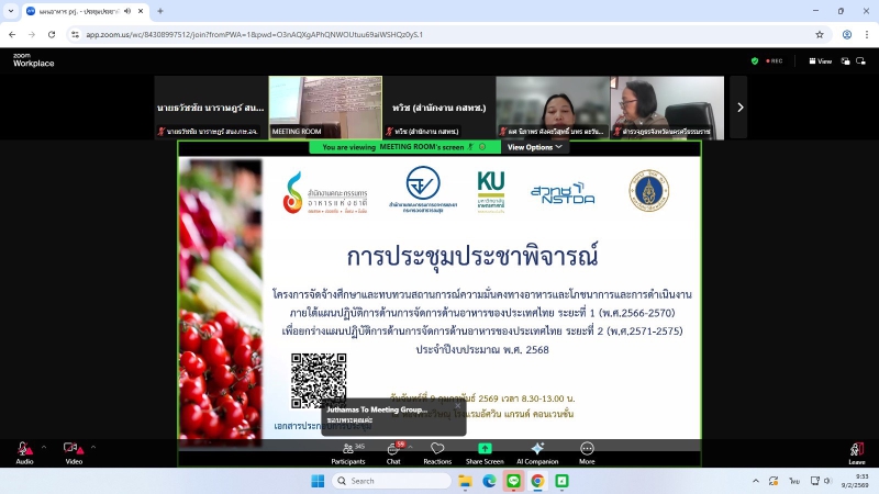 วันจันทร์ที่ 9 กุมภาพันธ์ พ.ศ. 2569 เวลา 08.30 – 13.00 น. นางปารีณา สอนอาจ เกษตรและสหกรณ์จังหวัดอำนาจเจริญ มอบหมายนายธวัชชัย นาราษฎร์ หัวหน้ากลุ่มช่วยเหลือเกษตรกรและโครงการพิเศษ ประชุมประชาพิจารณ์ของการจัดจ้างศึกษาและทบทวนสถานการณ์ความมั่นคงทางอาหารและโภชนาการ และการดำเนินงานภายใต้แผนปฏิบัติการด้านการจัดการด้านอาหารของประเทศไทย ระยะที่ 1 (พ.ศ. 2566 – 2570) เพื่อยกร่างแผนปฏิบัติการด้านการจัดการด้านอาหารของประเทศไทยระยะที่ 2 (พ.ศ. 2571 - 2575) ประจำปีงบประมาณ พ.ศ. 2568 ผ่านทางออนไลน์ผ่านโปรแกรม Zoom Meeting โดยมีรองศาสตราจารย์ ดร.วิษณุ อรรถวานิช อาจารย์ประจำภาควิชาเศรษฐศาสตร์ คณะเศรษฐศาสตร์ มหาวิทยาลัยเกษตรศาสตร์ เป็นหัวหน้าโครงการ