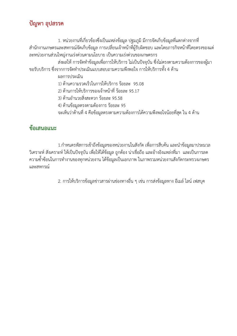 1. หน่วยงานที่เกี่ยวข้องซึ่งเป็นแหล่งข้อมูล ปฐมภูมิ มีการจัดเก็บข้อมูลที่แตกต่างจากที่สำนักงานเกษตรและสหกรณ์จัดเก็บข้อมูล การเปลี่ยนเจ้าหน้าที่ผู้รับผิดชอบ และโดยภารกิจหน้าที่โดยตรงของแต่ละหน่วยงานส่วนใหญ่งานเร่งด่วนตามนโยบาย เป็นความเร่งด่วนของเกษตรกร ส่งผลให้ การจัดทำข้อมูลเพื่อการให้บริการ ไม่เป็นปัจจุบัน ซึ่งไม่ตรงตามความต้องการของผู้มาขอรับบริการ ซึ่งจากการจัดทำประเมินแบบสอบถามความพึงพอใจ การให้บริการทั้ง 4 ด้าน