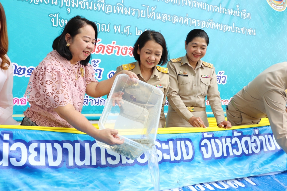 โดยโครงการบริหารจัดการทรัพยากรประมง กิจกรรมบริหารจัดการทรัพยากรประมงน้ำจืดการเพิ่มผลผลิตสัตว์น้ำในแหล่งน้ำชุมชนเพื่อเพิ่มรายได้และลดค่าครองชีพของประชาชน ประจำปีงบประมาณ พ.ศ. 2568 มีวัตถุประสงค์เพื่อเพิ่มผลผลิตสัตว์น้ำจืดมูลค่าสูงในแหล่งน้ำชุมชน เพื่อให้เกษตรกร ประชาชน และชุมชนในพื้นที่มีอาหารสัตว์น้ำไว้บริโภคและมีรายได้จากการจำหน่ายสัตว์น้ำ รวมทั้งสร้างเสริมการมีส่วนร่วมในการบริหารจัดการทรัพยากรประมงโดยชุมชนมีส่วนร่วม เพื่อเพิ่มรายได้และลดค่าครองชีพของประชาชน ซึ่งโครงการได้มีการดำเนินการในแหล่งน้ำชุมชน ขนาด 10-16 ไร่ จำนวน 1,500 แห่งทั่วประเทศ โดยจังหวัดอ่างทองได้รับอนุมัติให้ดำเนินโครงการฯในแหล่งน้ำสาธารณะ รวม 21แห่ง พื้นที่ 7 อำเภอ เพื่อปล่อยพันธุ์สัตว์น้ำ จำนวน 7 ชนิด แห่งละ 77,600 ตัว รวมพันธุ์สัตว์น้ำที่ปล่อย 1,629,600 ตัว