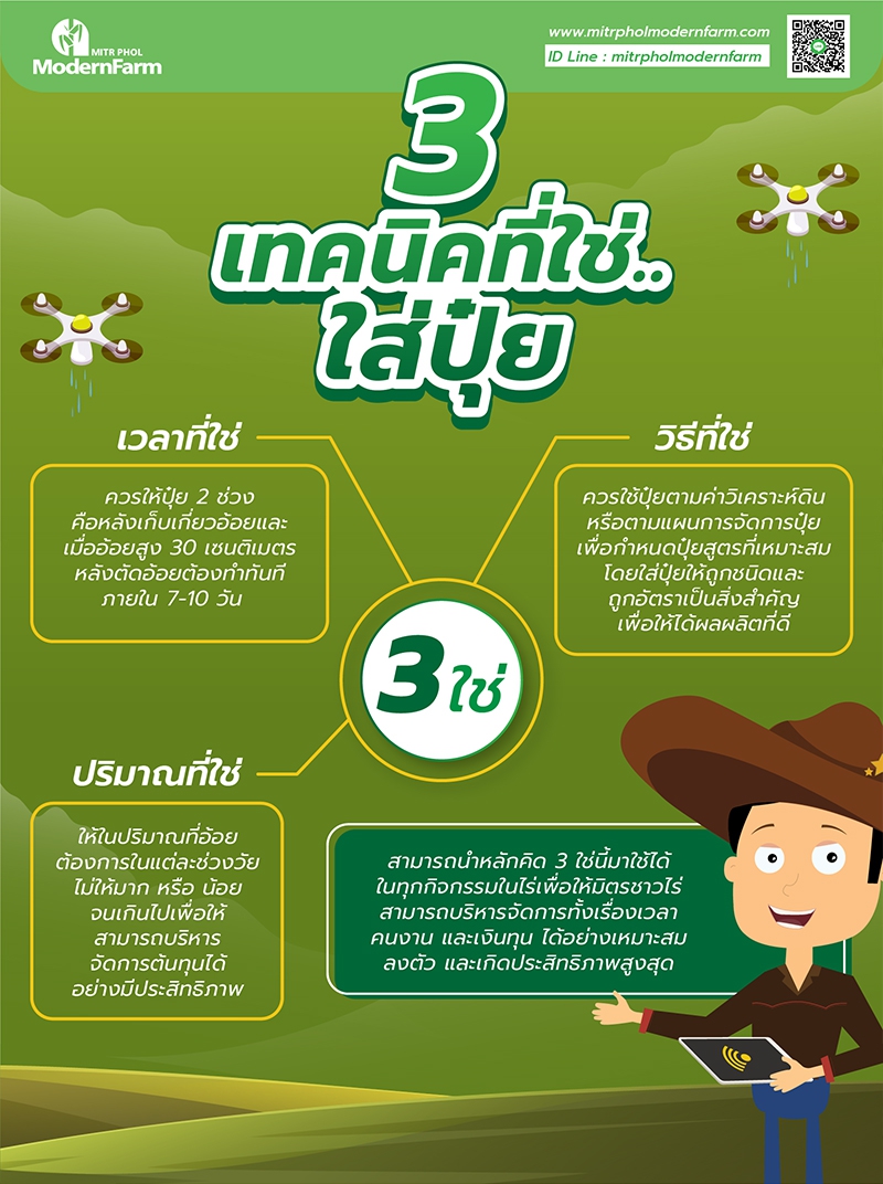 การทำไร่อ้อยสมัยใหม่ตามแบบฉบับมิตรผลโมเดิร์นฟาร์ม เรากล่าวเสมอว่าการทำกิจกรรมในไร่อ้อย ต้องนำหลักคิด 3 ใช่ มาใช้ให้เหมาะสม ทั้งเวลาที่ใช่ วิธีที่ใช่ และปริมาณที่ใช่ อย่างเช่นการใส่ปุ๋ยที่เรากำลังจะกล่าวต่อไปนี้ ที่หากไม่นำหลัก 3 ใช่เข้ามาช่วย การใส่ปุ๋ยบำรุงอ้อยจะสูญเปล่าทั้งเวลาและเงินลงทุน