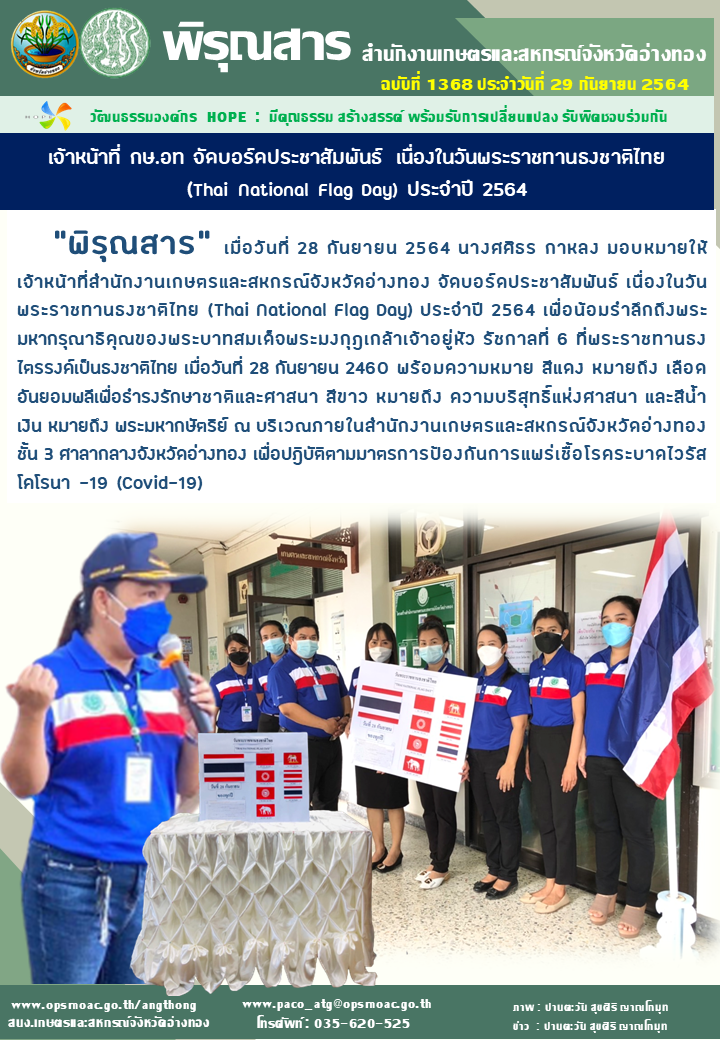 “พิรุณสาร” เมื่อวันที่ 28 กันยายน 2564 นางศศิธร กาหลง มอบหมายให้ เจ้าหน้าที่สำนักงานเกษตรและสหกรณ์จังหวัดอ่างทอง จัดบอร์ดประชาสัมพันธ์ เนื่องในวันพระราชทานธงชาติไทย (Thai National Flag Day) ประจำปี 2564 เพื่อน้อมรำลึกถึงพระมหากรุณาธิคุณของพระบาทสมเด็จพระมงกุฎเกล้าเจ้าอยู่หัว รัชกาลที่ 6 ที่พระราชทานธงไตรรงค์เป็นธงชาติไทย เมื่อวันที่ 28 กันยายน 2460 พร้อมความหมาย สีแดง หมายถึง เลือดอันยอมพลีเพื่อธำรงรักษาชาติและศาสนา สีขาว หมายถึง ความบริสุทธิ์แห่งศาสนา และสีน้ำเงิน หมายถึง พระมหากษัตริย์ ณ บริเวณภายในสำนักงานเกษตรและสหกรณ์จังหวัดอ่างทอง ชั้น 3 ศาลากลางจังหวัดอ่างทอง เพื่อปฎิบัติตามมาตรการป้องกันการแพร่เชื้อโรคระบาดไวรัสโคโรนา -19 (Covid-19)