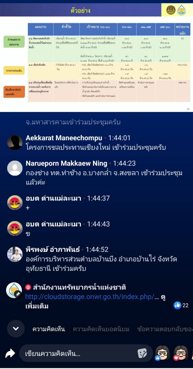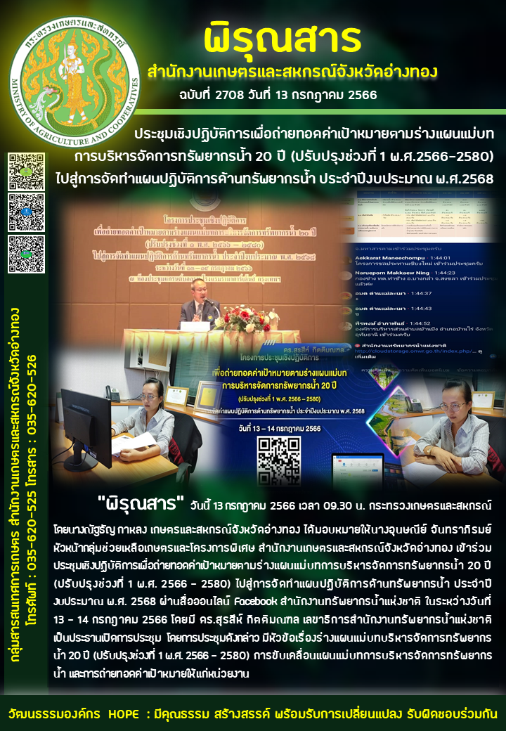 “พิรุณสาร” วันนี้ 13 กรกฎาคม 2566 เวลา 09.30 น. กระทรวงเกษตรและสหกรณ์ โดยนางณัฐธัญ กาหลง เกษตรและสหกรณ์จังหวัดอ่างทอง ได้มอบหมายให้นางอุนษณีย์ จันทราภิรมย์ หัวหน้ากลุ่มช่วยเหลือเกษตรและโครงการพิเศษ สำนักงานเกษตรและสหกรณ์จังหวัดอ่างทอง เข้าร่วมประชุมเชิงปฏิบัติการเพื่อถ่ายทอดค่าเป้าหมายตามร่างแผนแม่บทการบริหารจัดการทรัพยากรน้ำ 20 ปี (ปรับปรุงช่วงที่ 1 พ.ศ. 2566 - 2580) ไปสู่การจัดทำแผนปฏิบัติการด้านทรัพยากรน้ำ ประจำปีงบประมาณ พ.ศ. 2568 ผ่านสื่อออนไลน์ Facebook สำนักงานทรัพยากรน้ำแห่งชาติ ในระหว่างวันที่ 13 - 14 กรกฎาคม 2566 โดยมี ดร.สุรสีห์ กิตติมณฑล เลขาธิการสำนักงานทรัพยากรน้ำแห่งชาติ เป็นประธานเปิดการประชุม โดยการประชุมดังกล่าว มีหัวข้อเรื่องร่างแผนแม่บทบริหารจัดการทรัพยากรน้ำ 20 ปี (ปรับปรุงช่วงที่ 1 พ.ศ. 2566 – 2580) การขับเคลื่อนแผนแม่บทการบริหารจัดการทรัพยากรน้ำ และการถ่ายทอดค่าเป้าหมายให้แก่หน่วยงาน