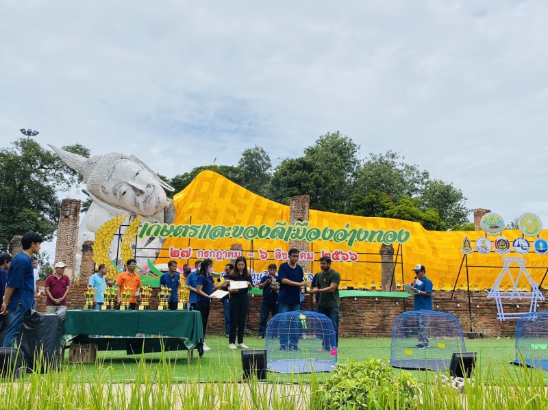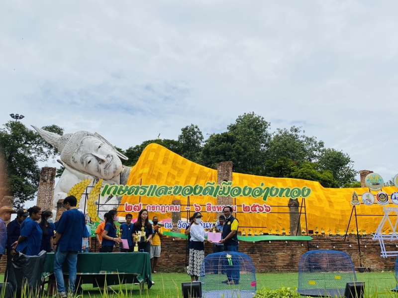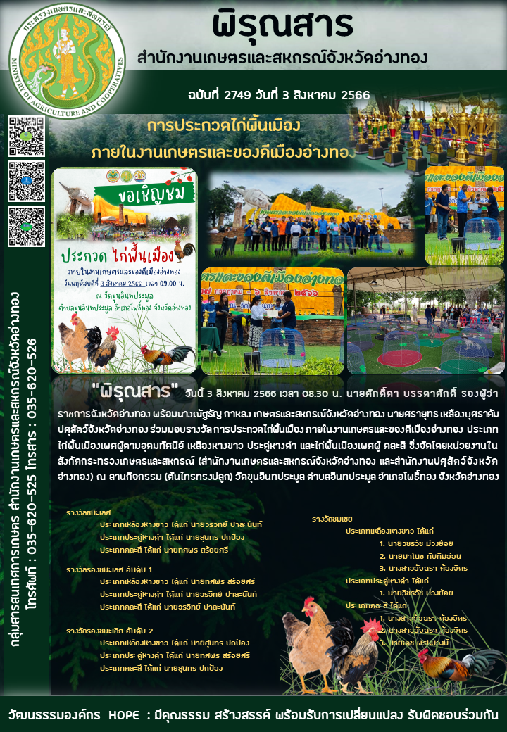 “พิรุณสาร” วันนี้ 3 สิงหาคม 2566 เวลา 08.30 น. นายศักดิ์ดา บรรดาศักดิ์ รองผู้ว่าราชการจังหวัดอ่างทอง พร้อมนางณัฐธัญ กาหลง เกษตรและสหกรณ์จังหวัดอ่างทอง นายศรายุทธ เหลืองบุศราคัม ปศุสัตว์จังหวัดอ่างทอง ร่วมมอบรางวัล การประกวดไก่พื้นเมือง ภายในงานเกษตรและของดีเมืองอ่างทอง ประเภท ไก่พื้นเมืองเพศผู้ตามอุดมทัศนีย์ เหลืองหางขาว ประดู่หางดำ และไก่พื้นเมืองเพศผู้ คละสี ซึ่งจัดโดยหน่วยงานในสังกัดกระทรวงเกษตรและสหกรณ์ (สำนักงานเกษตรและสหกรณ์จังหวัดอ่างทอง และสำนักงานปศุสัตว์จังหวัดอ่างทอง) ณ ลานกิจกรรม (ต้นไทรทรงปลูก) วัดขุนอินทประมูล ตำบลอินทประมูล อำเภอโพธิ์ทอง จังหวัดอ่างทอง