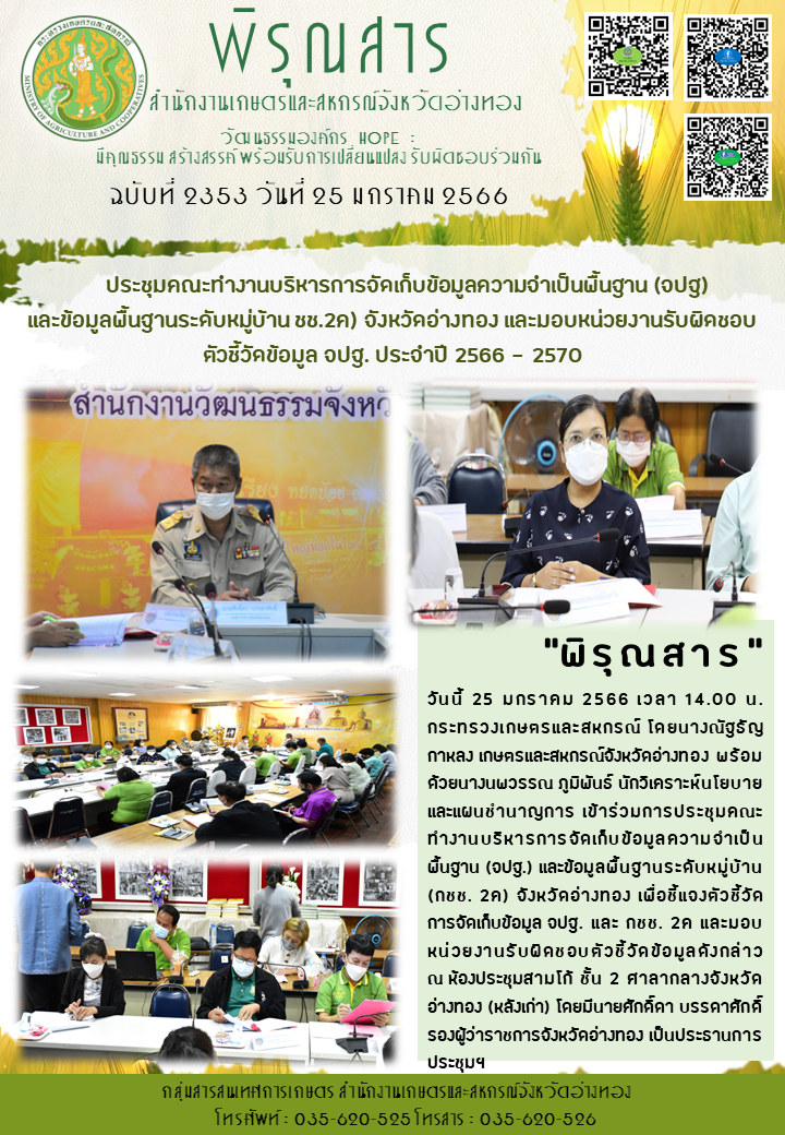 “พิรุณสาร” วันนี้ 25 มกราคม 2566 เวลา 14.00 น. กระทรวงเกษตรและสหกรณ์ โดยนางณัฐธัญ กาหลง เกษตรและสหกรณ์จังหวัดอ่างทอง พร้อมด้วยนางนพวรรณ ภูมิพันธ์ นักวิเคราะห์นโยบายและแผนชำนาญการ เข้าร่วมการประชุุมคณะทำงานบริหารการจัดเก็บข้อมูลความจำเป็นพื้นฐาน (จปฐ.) และข้อมูลพื้นฐานระดับหมู่บ้าน (กชช. 2ค) จังหวัดอ่างทอง เพื่อชี้แจงตัวชี้วัดการจัดเก็บข้อมูล จปฐ. และ กชช. 2ค และมอบหน่วยงานรับผิดชอบตัวชี้วัดข้อมูลดังกล่าว ณ ห้องประชุมสามโก้ ชั้น 2 ศาลากลางจังหวัดอ่างทอง (หลังเก่า) โดยมีนายศักดิ์ดา บรรดาศักดิ์ รองผู้ว่าราชการจังหวัดอ่างทอง เป็นประธานการประชุมฯ