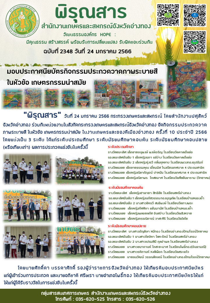 “พิรุณสาร” วันที่ 24 มกราคม 2566 กระทรวงเกษตรและสหกรณ์ โดยสำนักงานปศุสัตว์จังหวัดอ่างทอง ร่วมกับหน่วยงานในสังกัดกระทรวงเกษตรและสหกรณ์จังหวัดอ่างทอง จัดกิจกรรมประกวดวาดภาพระบายสี ในหัวข้อ เกษตรกรรมนำสมัย ในงานเกษตรและของดีเมืองอ่างทอง ครั้งที่ 10 ประจำปี 2566 โดยแบ่งเป็น 3 ระดับ ได้แก่ระดับประถมศึกษา ระดับมัธยมศึกษาตอนต้น ระดับมัธยมศึกษาตอนปลาย (หรือเทียบเท่า) ผลการประกวดแข่งขันในครั้งนี้