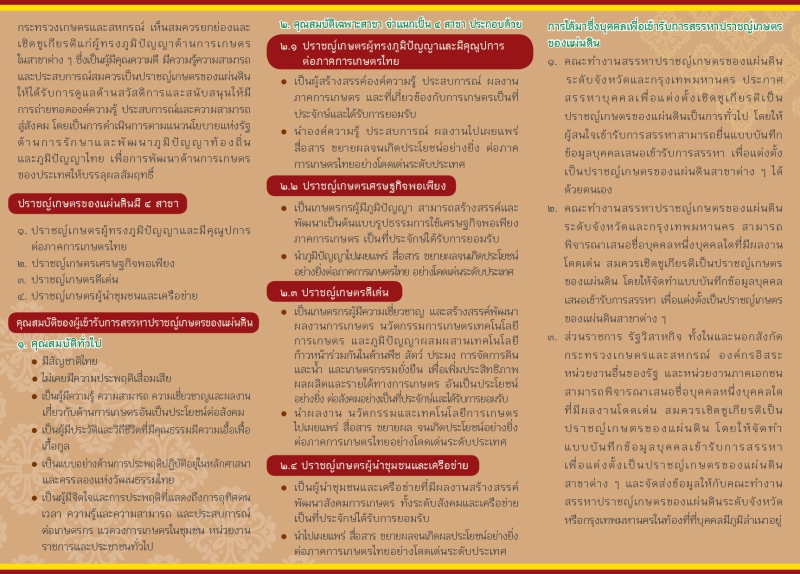 1. สาขาปราชญ์เกษตรผู้ทรงภูมิปัญญา และมีคุณูปการต่อภาคการเกษตรไทย