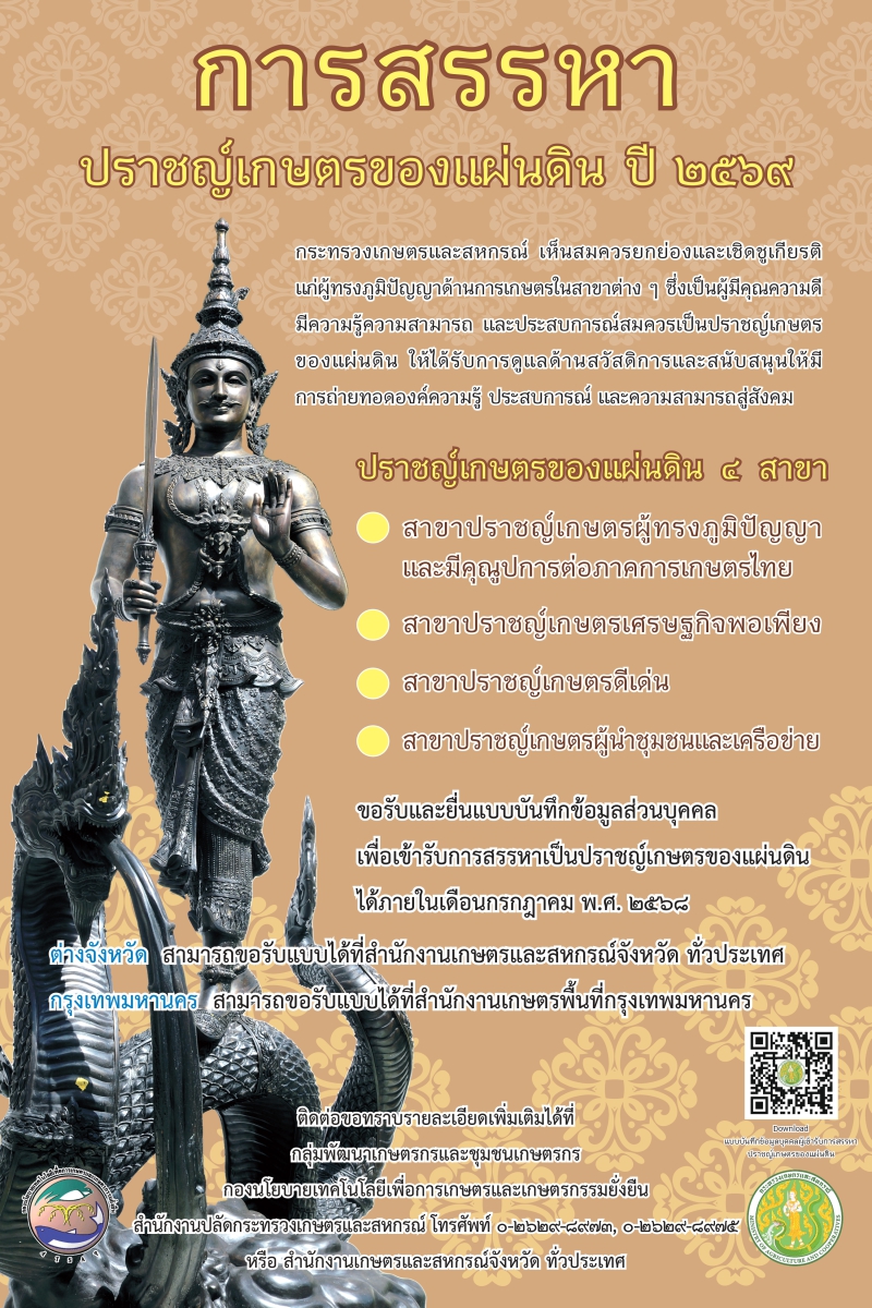 สำนักงานเกษตรและสหกรณ์จังหวัดอ่างทอง ขอเชิญชวนเกษตรกรหรือผู้ทรงภูมิปัญญาด้านการเกษตร ในสาขาต่าง ๆ สมัครเข้ารับการสรรหาปราชญ์เกษตรของแผ่นดิน ประจำปี 2569 ระดับจังหวัดอ่างทอง
