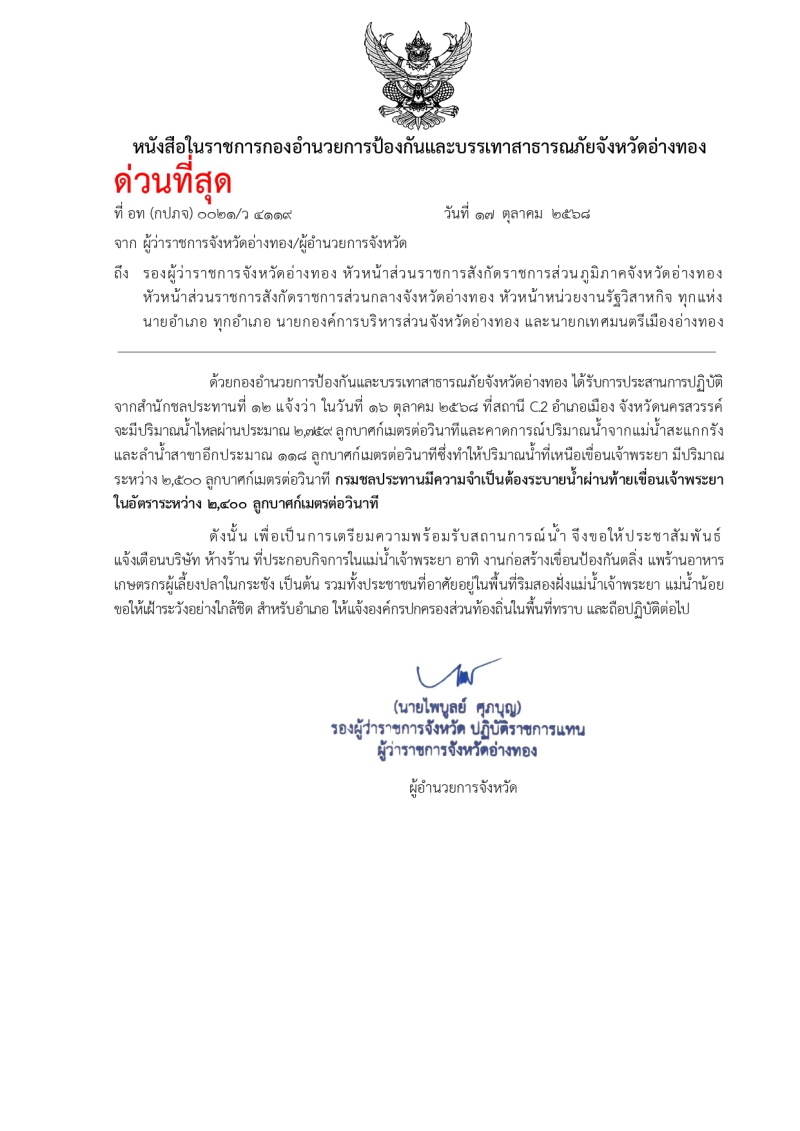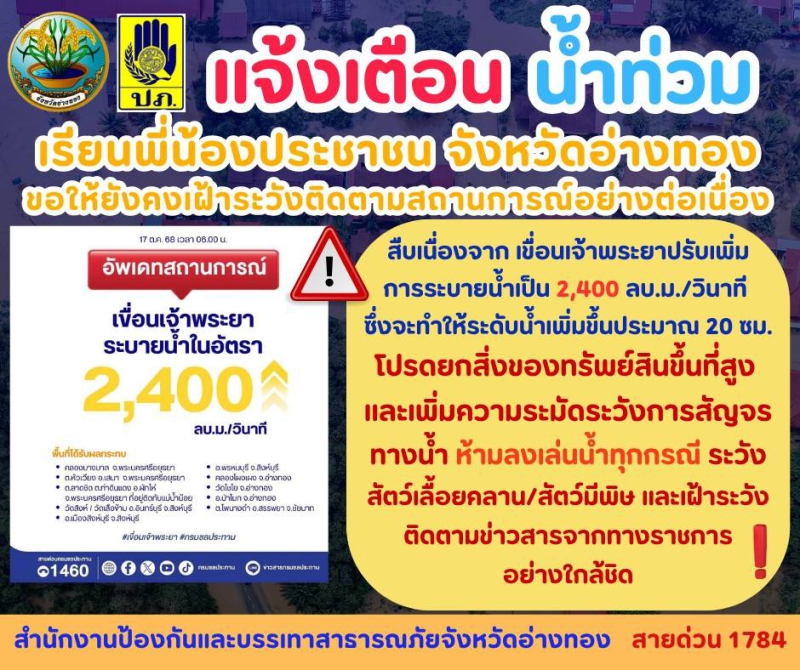 *****จังหวัดอ่างทองแจ้งเตือนทุกพื้นที่ เฝ้าระวังสถานการณ์อุทกภัยอย่างใกล้ชิด ในช่วงนี้มีฝนตกหนักในหลายพื้นที่ และเขื่อนเจ้าพระยาแจ้งปรับเพิ่มการระบายน้ำเป็น 2,400 ลบ.ม. ต่อวินาที ซึ่งจะทำให้ระดับน้ำในแม่น้ำเพิ่มสูงขึ้นประมาณ 20 ถึง 30 ซม.
