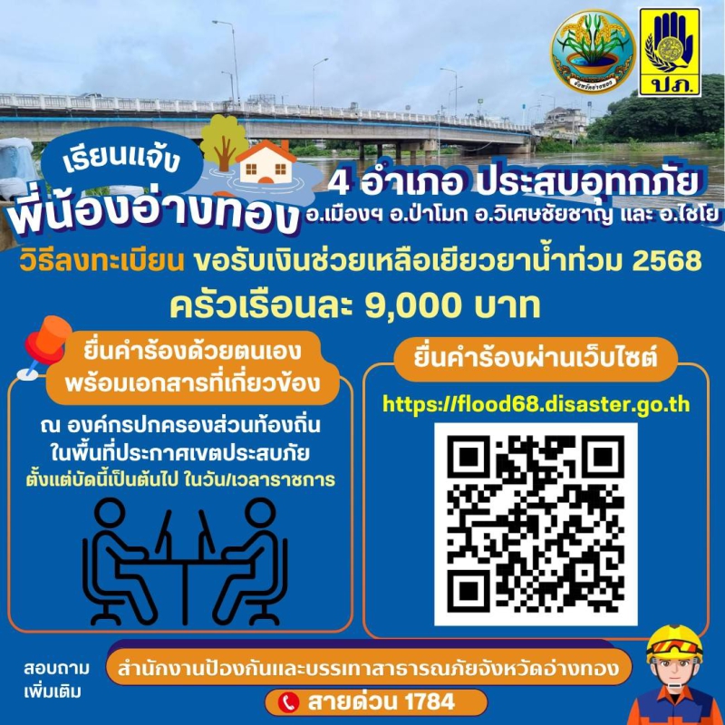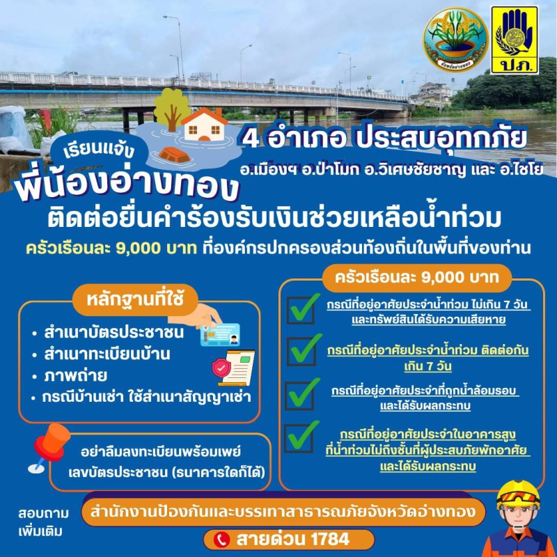 จังหวัดอ่างทอง แจ้งเตือน "น้ำท่วม"