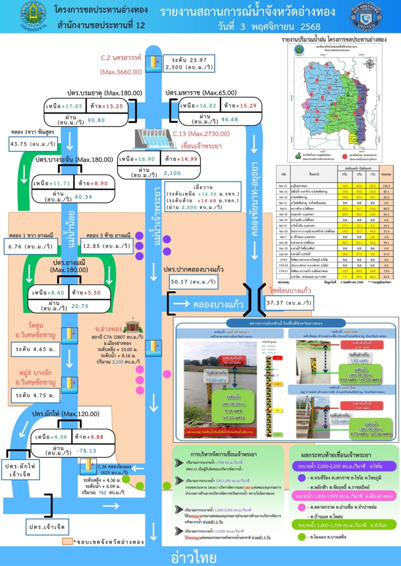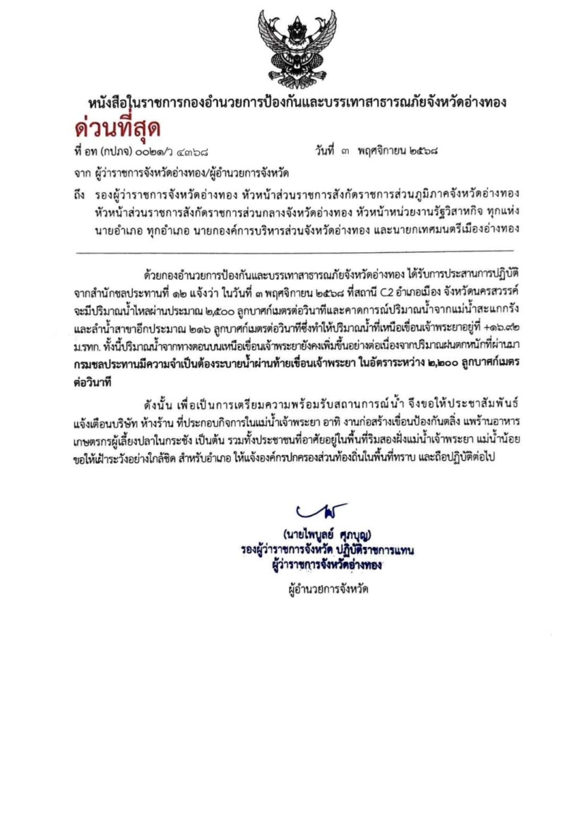 จังหวัดอ่างทอง แจ้งเตือนประชาชนปรับเพิ่มการระบายน้ำ เป็น 2,200 ลบ.ม.ต่อวินาที