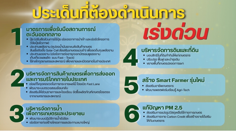 โดยมุ่งขับเคลื่อนผ่านการบูรณาการระหว่างหน่วยงานภาครัฐและทุกภาคส่วนที่เกี่ยวข้อง เน้นการทำงานเชิงรุก ลดขั้นตอนที่ไม่จำเป็นลง เร่งการนำเทคโนโลยีดิจิทัลมาช่วยในการทำงานให้มีความคล่องตัวมากขึ้น พร้อมอำนวยความสะดวกให้กับเกษตรกรได้อย่างรวดเร็วและมีประสิทธิภาพ