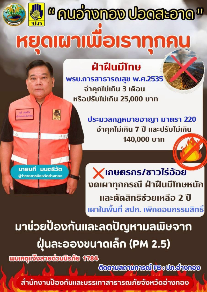 จังหวัดอ่างทอง ขอความร่วมมือพี่น้องประชาชน งดเว้นการเผาในพืนที่โล่ง ทุกกรณี