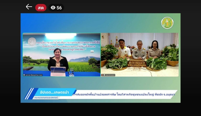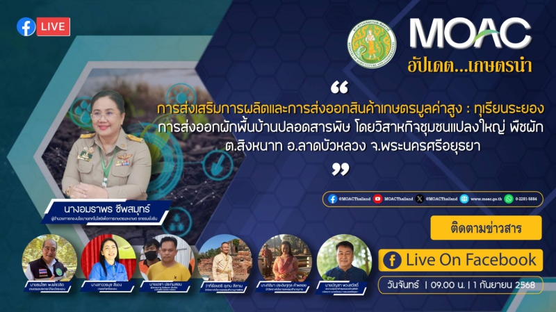 วันที่ 1 กันยายน 2568 นางวรรณ์ภัสสร ศรีจันทร์ เกษตรและสหกรณ์จังหวัดพระนครศรีอยุธยา มอบหมายเจ้าหน้าที่สำนักงานเกษตรและสหกรณ์จังหวัดพระนครศรีอยุธยา พร้อมด้วยนายบัญชา พวงสวัสดิ์ ประธานกลุ่มวิสาหกิจชุมชนแปลงใหญ่พืชผัก ร่วมดำเนินรายการ อัปเดต เกษตรนำ ในหัวข้อ การส่งเสริมการผลิตและการส่งออกสินค้าเกษตรมูลค่าสูง : การส่งออกผักพื้นบ้านปลอดสารพิษ ของวิสาหกิจชุมชนแปลงใหญ่พืชผักตำบลสิงหนาท อำเภอลาดบัวหลวง จังหวัดพระนครศรีอยุธยา โดยมีนางอมราพร ชีพสมุทร์ ผู้อำนวยการกองนโยบายเทคโนโลยีเพื่อการเกษตรและเกษตรกรรมยั่งยืน เป็นผู้ดำเนินรายการดังกล่าว ผ่านระบบ Live Facebook