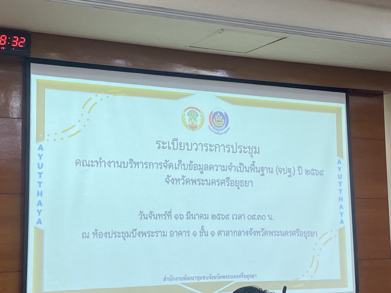 วันที่ 16 มีนาคม 2569 นายวิโรจน์ ทรงรัตนา เกษตรและสหกรณ์จังหวัดพระนครศรีอยุธยา มอบหมายนางปราณี สุขฉัตร เจ้าหน้าที่กลุ่มสารสนเทศการเกษตร สำนักงานเกษตรและสหกรณ์จังหวัดพระนครศรีอยุธยา ร่วมประชุมคณะทำงานบริหารการจัดเก็บข้อมูลความจำเป็นพื้นฐาน (จปฐ.) ปี 2569 ระดับจังหวัด เพื่อนำเสนอผลการจัดเก็บและรับรองคุณภาพข้อมูลความจำเป็นพื้นฐาน (จปฐ.) ระดับจังหวัด โดยมี นางพุทธิพร พลอยผักแว่น รองผู้ว่าราชการจังหวัดพระนครศรีอยุธยา เป็นประธานการประชุมดังกล่าว ณ ห้องประชุมบึงพระราม อาคาร 1 ชั้น 1 ศาลากลางจังหวัดพระนครศรีอยุธยา