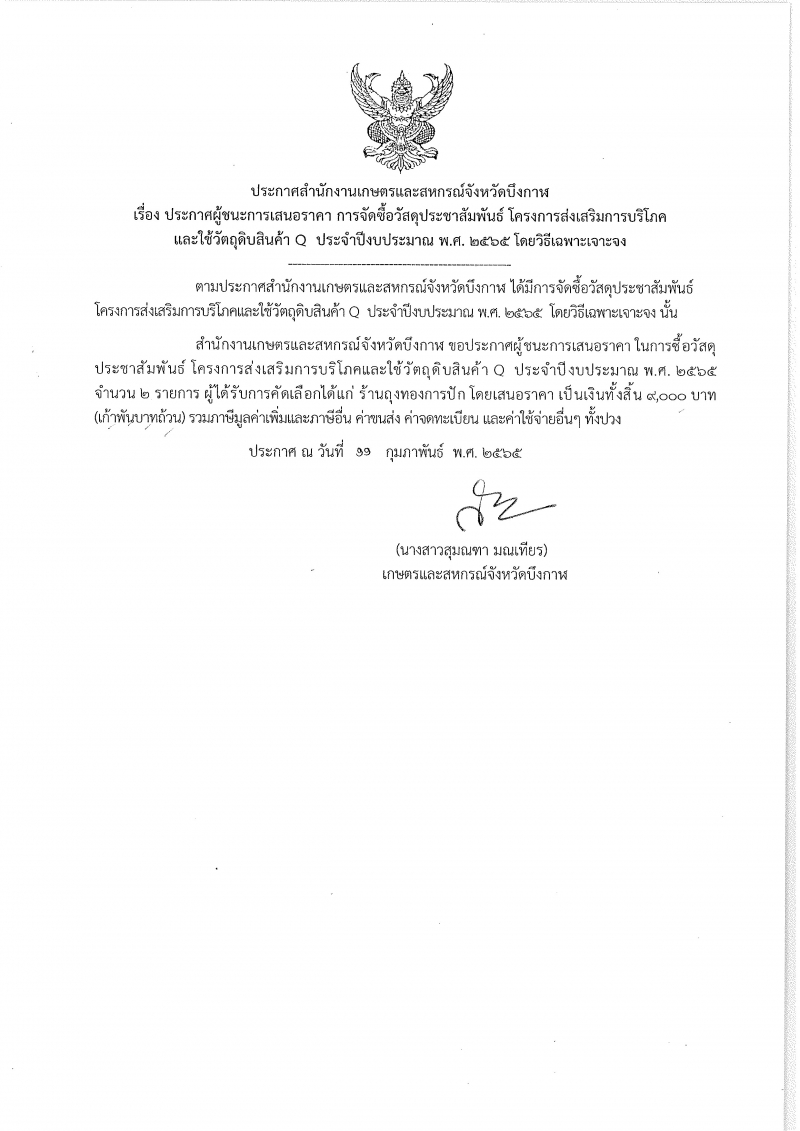 ประกาศสำนักงานเกษตรเเละสหกรณ์จังหวัดบึงกาฬ เรื่อง ประกาศผู้ชนะการเสนอราคา การจัดซื้อวัสดุประชาสัมพันธ์ โครงการส่งเสริมการบริโภค เเละใช้วัตถุดิบสินค้า Q ประจำปีงบประมาณ พ.ศ. ๒๕๖๕ โดยวิธีเฉพาะเจาะจง