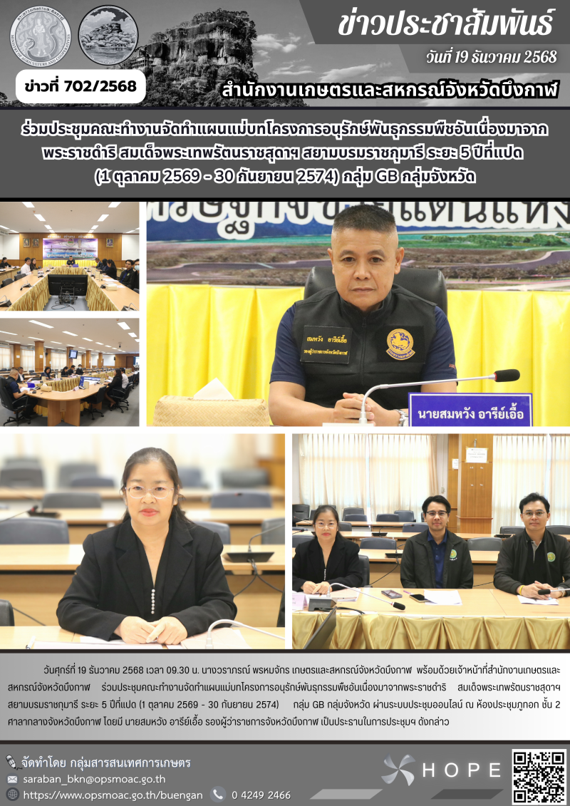 วันศุกร์ที่ 19 ธันวาคม 2568 เวลา 09.30 น. นางวราภรณ์ พรหมจักร เกษตรและสหกรณ์จังหวัดบึงกาฬ พร้อมด้วย เจ้าหน้าที่สำนักงานเกษตรและสหกรณ์จังหวัดบึงกาฬ ร่วมประชุมคณะทำงานจัดทำแผนแม่บทโครงการอนุรักษ์พันธุกรรมพืชอันเนื่องมาจากพระราชดำริ สมเด็จพระเทพรัตนราชสุดาฯ สยามบรมราชกุมารี ระยะ 5 ปีที่แปด (1 ตุลาคม 2569 - 30 กันยายน 2574) กลุ่ม GB กลุ่มจังหวัด ผ่านระบบประชุมออนไลน์ ณ ห้องประชุมภูทอก ชั้น 2 ศาลากลางจังหวัดบึงกาฬ โดยมี นายสมหวัง อารีย์เอื้อ รองผู้ว่าราชการจังหวัดบึงกาฬ เป็นประธานในการประชุมฯ ดังกล่าว