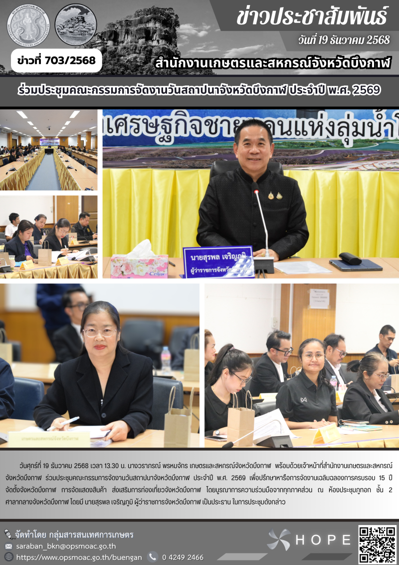 วันศุกร์ที่ 19 ธันวาคม 2568 เวลา 13.30 น. นางวราภรณ์ พรหมจักร เกษตรและสหกรณ์จังหวัดบึงกาฬ พร้อมด้วยเจ้าหน้าที่สำนักงานเกษตรและสหกรณ์จังหวัดบึงกาฬ ร่วมประชุมคณะกรรมการจัดงานวันสถาปนาจังหวัดบึงกาฬ ประจำปี พ.ศ. 2569 เพื่อปรึกษาหารือการจัดงานเฉลิมฉลองการครบรอบ 15 ปี จัดตั้งจังหวัดบึงกาฬ การจัดแสดงสินค้า ส่งเสริมการท่องเที่ยวจังหวัดบึงกาฬ โดยบูรณาการความร่วมมือจากทุกภาคส่วน ณ ห้องประชุมภูทอก ชั้น 2 ศาลากลางจังหวัดบึงกาฬ โดยมี นายสุรพล เจริญภูมิ ผู้ว่าราชการจังหวัดบึงกาฬ เป็นประธาน ในการประชุมดังกล่าว