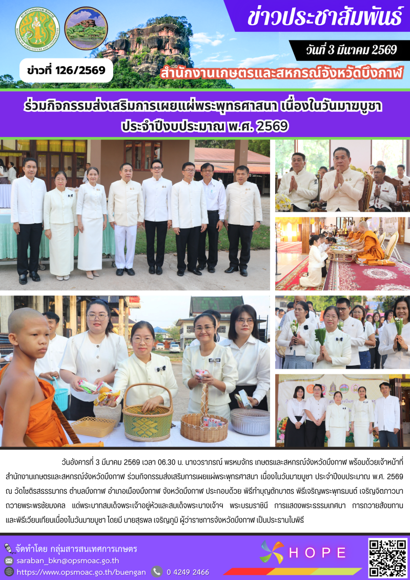 วันอังคารที่ 3 มีนาคม 2569 เวลา 06.30 น. นางวราภรณ์ พรหมจักร เกษตรและสหกรณ์จังหวัดบึงกาฬ พร้อมด้วยเจ้าหน้าที่สำนักงานเกษตรและสหกรณ์จังหวัดบึงกาฬ ร่วมกิจกรรมส่งเสริมการเผยแผ่พระพุทธศาสนา เนื่องในวันมาฆบูชา ประจำปีงบประมาณ พ.ศ. 2569 ณ วัดโชติรสธรรมากร ตำบลบึงกาฬ อำเภอเมืองบึงกาฬ จังหวัดบึงกาฬ ประกอบด้วย พิธีทำบุญตักบาตร พิธีเจริญพระพุทธมนต์ เจริญจิตภาวนาถวายพระพรชัยมงคล แด่พระบาทสมเด็จพระเจ้าอยู่หัวและสมเด็จพระนางเจ้าฯ พระบรมราชินี การแสดงพระธรรมเทศนา การถวายสังฆทาน และพิธีเวียนเทียนเนื่องในวันมาฆบูชา โดยมี นายสุรพล เจริญภูมิ ผู้ว่าราชการจังหวัดบึงกาฬ เป็นประธานในพิธี