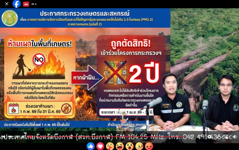 วันอังคารที่ 17 กุมภาพันธ์ 2569 เวลา 09.00 น. นางวราภรณ์ พรหมจักร เกษตรและสหกรณ์จังหวัดบึงกาฬ มอบหมายให้ นายภูเบศ สายวาริน ตำแหน่งหัวหน้ากลุ่มสารสนเทศการเกษตร และนายนฤดล คุณปัญญา ตำแหน่งหัวหน้ากลุ่มช่วยเหลือเกษตรกรและโครงการพิเศษ ร่วมจัดรายการประชาสัมพันธ์ข้อมูลข่าวสารด้านการเกษตรและสหกรณ์ ผ่านรายการวิทยุ ส.ว.ท.บึงกาฬ FM 104.5 MHz. ณ สถานีวิทยุกระจายเสียงแห่งประเทศไทยจังหวัดบึงกาฬ โดยประชาสัมพันธ์มาตรการห้ามเผาเพื่อป้องกันปัญหาฝุ่นละอองขนาดเล็ก PM2.5 ประชาสัมพันธ์โครงการร้านอาหารวัตถุดิบปลอดภัยเลือกใช้สินค้า Q (Q Restaurant) ประชาสัมพันธ์แหล่งเงินทุนในการประกอบอาชีพ (กองทุนสงเคราะห์เกษตรกร) ประชาสัมพันธ์กองทุนหมุนเวียนเพื่อการกู้ยืมแก่เกษตรกรและผู้ยากจน ในการแก้ปัญหาหนี้สิน และประชาสัมพันธ์การสรรหาปราชย์เกษตรของแผ่นดิน ประจำปี 2570 เพื่อให้ประชาชนหรือผู้รับฟังได้เข้าถึงข้อมูลข่าวสารจากหน่วยงานของรัฐที่เป็นประโยชน์ต่อไป