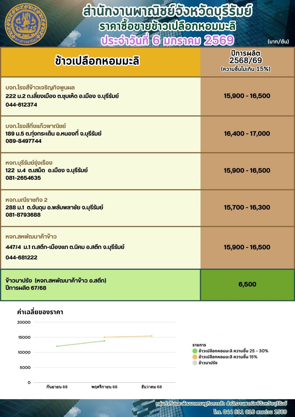 ราคาสินค้าเกษตรจังหวัดบุรีรัมย์ ประจำวันที่ 6 มกราคม 2569