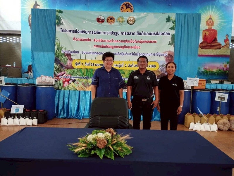 นางสาวสิรินาถ กีรติพงศ์พิศาล เกษตรอำเภอสตึก กล่าวรายงานเกี่ยวกับการบูรณาการทำงานร่วมกับที่ทำการปกครองอำเภอทุกอำเภอ สืบเนื่องจากปัจจุบันสถานการณ์ความไม่สงบและสงครามในภูมิภาคต่างๆ รวมทั้งวิกฤตการณ์ราคาน้ำมันเชื้อเพลิงที่ปรับตัวสูงขึ้นอย่างต่อเนื่อง ส่งผลให้ค่าขนส่งและค่าปัจจัยการผลิตทางการเกษตรพุ่งสูงขึ้น เกษตรกรส่วนใหญ่ประสบปัญหาภาระต้นทุนการผลิตที่สูงขึ้นอย่างต่อเนื่อง ประกอบกับการใช้สารเคมีทางการเกษตรติดต่อกันเป็นเวลานาน ส่งผลกระทบต่อคุณภาพและมาตรฐานความปลอดภัยของผลผลิตทางการเกษตร จากสถานการณ์ดังกล่าว จังหวัดบุรีรัมย์ โดยหน่วยงานในสังกัดกระทรวงเกษตรและสหกรณ์ จึงได้บูรณาการการทำงานร่วมกับที่ทำการปกครองอำเภอทุกอำเภอ จัดทำโครงการตามแผนปฏิบัติราชการ ประจำปีงบประมาณ พ.ศ. 2569 โครงการส่งเสริมการผลิต การแปรรูป การตลาดสินค้าเกษตรปลอดภัย กิจกรรมหลักส่งเสริมการสร้างความเข้มแข็งในกลุ่มเกษตรกรตามหลักปรัชญาของเศรษฐกิจพอเพียง ขึ้น โดยน้อมนําแนวพระราชดําริและหลักปรัชญาของเศรษฐกิจพอเพียง ของพระบาทสมเด็จพระบรมชนกาธิเบศร มหาภูมิพลอดุลยเดชมหาราช บรมนาถบพิตร ไปใช้เป็นหลักในการพัฒนาและแก้ไขปัญหาความเดือดร้อนของประชาชนในพื้นที่ ผ่านการอบรมถ่ายทอดความรู้การผลิตปุ๋ยหมักเพื่อทดแทนการใช้ปุ๋ยเคมี จำนวนเกษตรกรได้รับการฝึกอบรมและถ่ายทอดองค์ความรู้เทคโนโลยีการผลิตปุ๋ยอินทรีย์คุณภาพ จำนวน 23 อำเภอๆละ 100 ราย รวมทั้งสิ้น 2,300 ราย สามารถผลิตปุ๋ยอินทรีย์ (ปุ๋ยหมัก) ที่ผลิตจากวัสดุเหลือใช้ในท้องถิ่นเพื่อใช้ทดแทนปุ๋ยเคมี รวมไม่น้อยกว่า 322 ตัน และผลิตปุ๋ยอินทรีย์ (น้ำหมัก) รวมไม่น้อยกว่า 23,000 ลิตร และสามารถนำไปต่อยอดขยายผล เกษตรกร 1 ราย ถ่ายทอด 5 ราย ปริมาณปุ๋ยรวม 160,000 ตัน สามารถใช้ในพื้นที่การเกษตรได้ 160,000 ไร่ ทดแทนการใช้ปุ๋ยเคมีได้ถึงร้อยละ 30