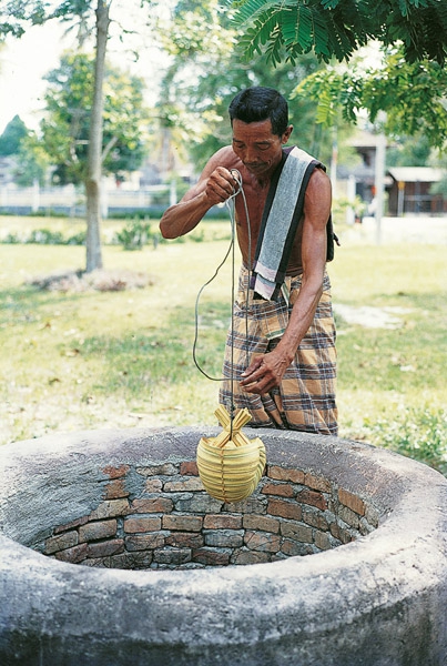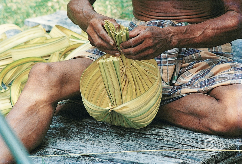 การทำเริ่มด้วยการตัดเอายอดจากที่เป็นยอดอ่อน ๆ ซึ่งมีใบรวมกันหนาแน่นและยังไม่แตกออกมาจากยอดเป็นใบ ๆ (ถ้ายอดเริ่มแตกใบก็แสดงว่าใบเริ่มแก่แล้วใช้ไม่ได้) นำเอายอดนั้นมาตัดเอาแต่ละใบที่เห็นว่ามีขนาดพอจะใช้ทำหมาได้ตากแดดให้พอ หมาด ๆ เพื่อนำไปสอดได้สะดวก เมื่อสอดต้องคลี่ใบออกข้างหนึ่งแล้วสอดให้แต่ละใบสลับโคน – ปลายไปเรื่อย ๆ เพื่อให้ปลายทั้งสอง ข้างมีขนาดเท่า ๆ กัน เมื่อสอดไปจนได้ขนาดตามต้องการก็รวบปลายทั้ง 2 ข้างเข้าหากันเพื่อผูกติดกันเป็นที่ถือเวลาจะใช้ตักน้ำ หมาที่ทำเสร็จแล้วอาจมีขนาดใหญ่ – เล็กต่างกัน ขึ้นอยู่กับขนาดความยาวและใหญ่ของจากที่นำมาสอดและจำนวนใบที่ใช้สอย และถ้าต้องการให้หมานั้นสวยงามและทนทาน ใบจากไม่แยกออกจากกันง่าย ๆ ก็ใช้หวายหรือคล้าแทงเย็บรอยต่อระหว่างใบจาก แต่ละใบตามแนวขวางของใบจากที่ สอดกันนั้น พยายามเย็บให้เป็นแนวตรงส่วนกลางของหมา เพราะเป็นส่วนหนึ่งที่ช่วยพยุงในการรับน้ำหนักของน้ำ การเย็บนี้อาจเย็บหลายแถวก็ได้ แต่ถ้าเป็นหมาขนาดเล็กไม่จำเป็นต้องเย็บ