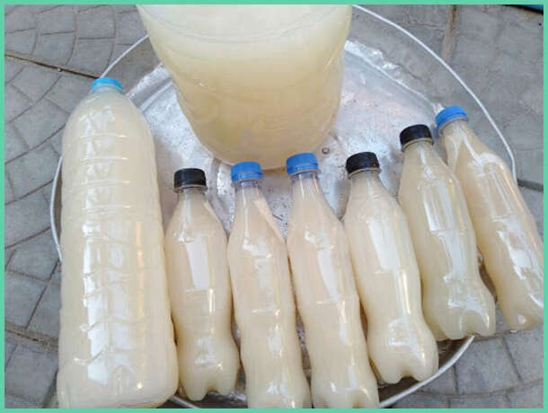 น้ำซาวข้าวกับนมจืดมาเทผสมรวมกัน โดยจะใช้อัตราส่วนตั้งแต่ 10 : 1 จนถึง 1 : 1 เลย จากนั้นนำใส่ขวดแล้วก็เขย่าให้ส่วนผสมเข้ากันดี แล้ววางพักไว้ รอจนน้ำหมักแยกออกมาเป็น 3 ชั้น ก็สามารถใช้งานได้แล้ว กลิ่นที่ได้จะ เหมือนกลิ่นบูดสักหน่อย