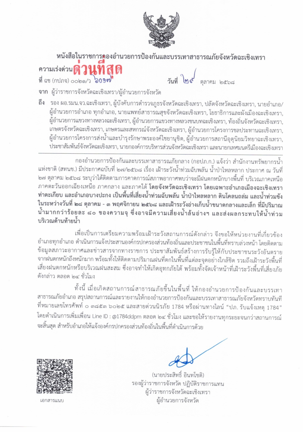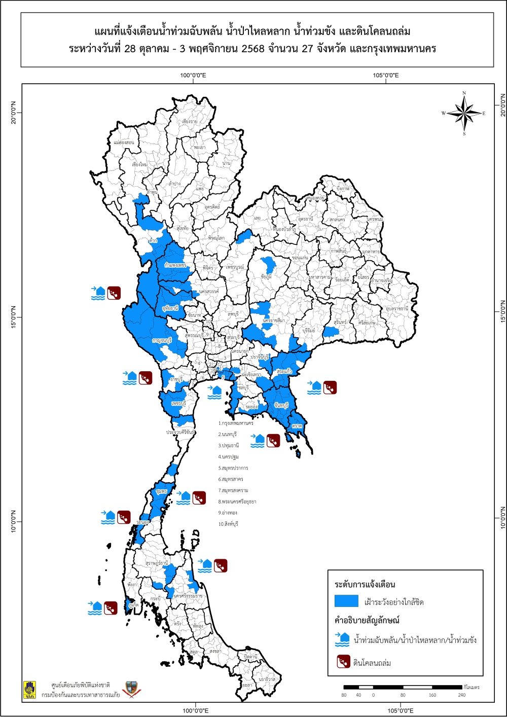 แจ้งเตือนน้ำท่วมฉับพลัน น้ำป่าไหลหลาก น้ำท่วมขัง และดินโคลนถล่ม ระหว่างวันที่ 28 ตุลาคม ถึง 3 พฤศจิกายน 2568