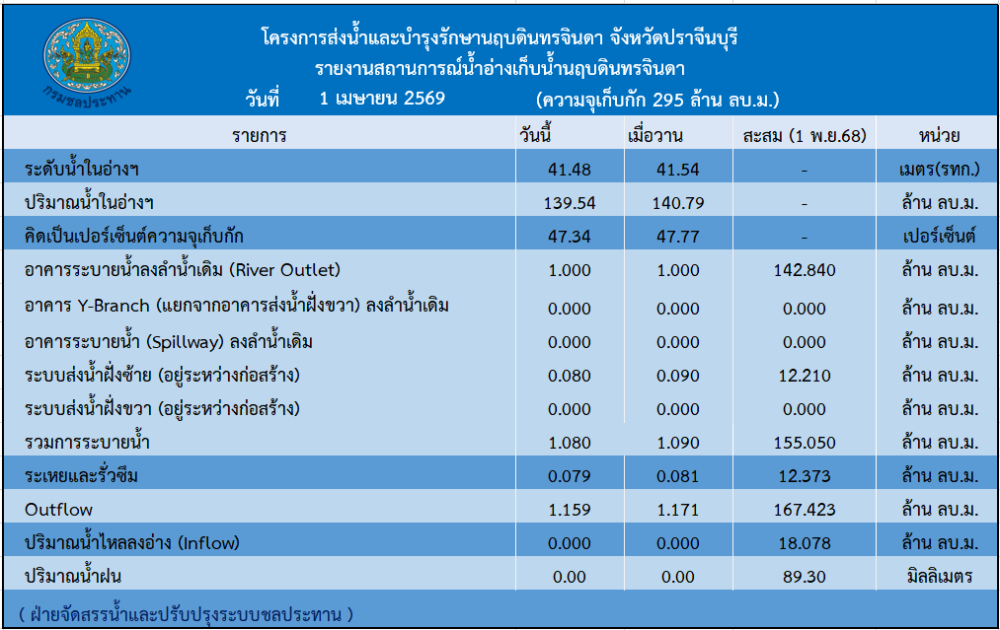 รายงานสถานการณ์น้ำประจำวันที่ 1เมษายน 2569