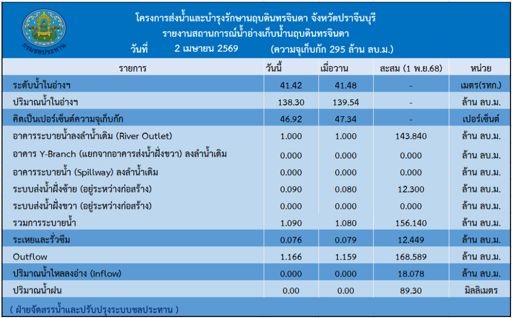 รายงานสถานการณ์น้ำประจำวันที่ 2 เมษายน 2569