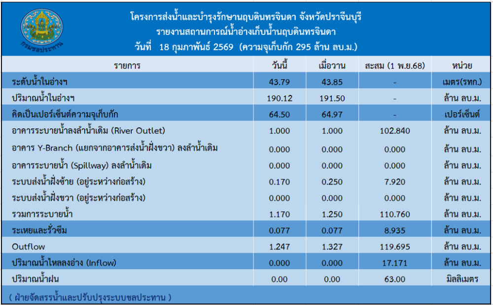 รายงานสถานการณ์น้ำประจำวันที่ 18 กุมภาพันธ์ 2569