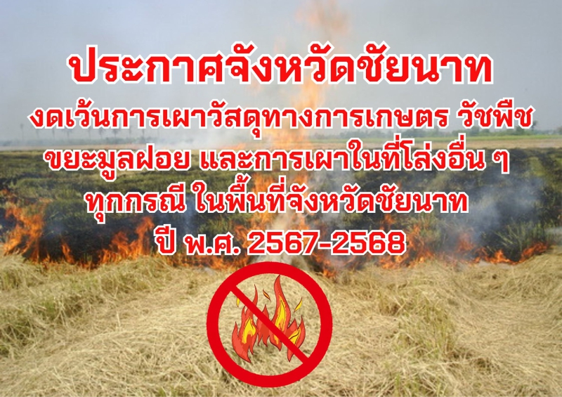 2. ประกาศจังหวัดชัยนาท เรื่องห้ามการเผาในที่โล่งทุกชนิดโดยเด็ดขาด ในพื้นที่จังหวัดชัยนาท ณ วันที่ 4 กุมภาพันธ์ 2568